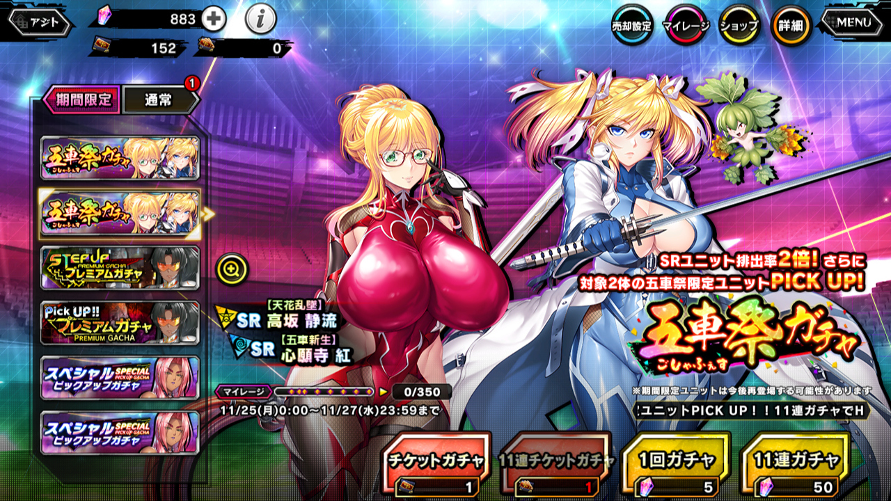 ▲五車祭ガチャは、あらかじめ立ち絵が発表されていた【天花乱墜】高坂静流と、【五車新生】心願寺紅。静流が自然のヒーラー兼サポーターで、紅が魔性のアタッカー(バフも得意)という性能。何故か大量にガチャチケットもあるし、今回は両方手に入れておきたい