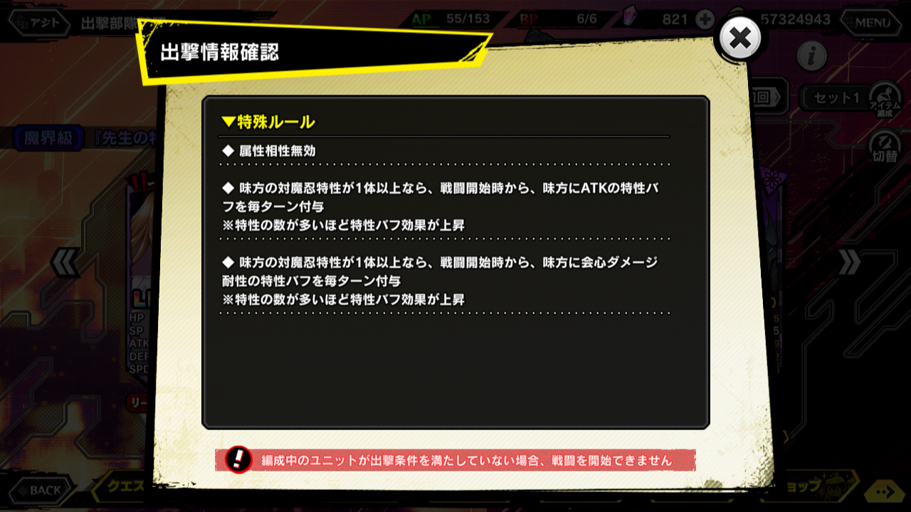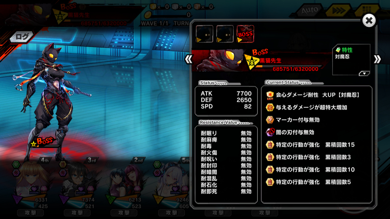 ▲という訳で、気分よく黒猫先生と戦う。超上級は守備的に編成して、アイテムを使いながらサポートのラグナロクに倒して貰えばいいので省略。魔界級の特殊ルールはこちら。属性を考えずに、対魔忍部隊を組むのがよさそう。黒猫先生が鬼・不死・魔術特攻を持つので、これらの特性はなるべく入れたくない
