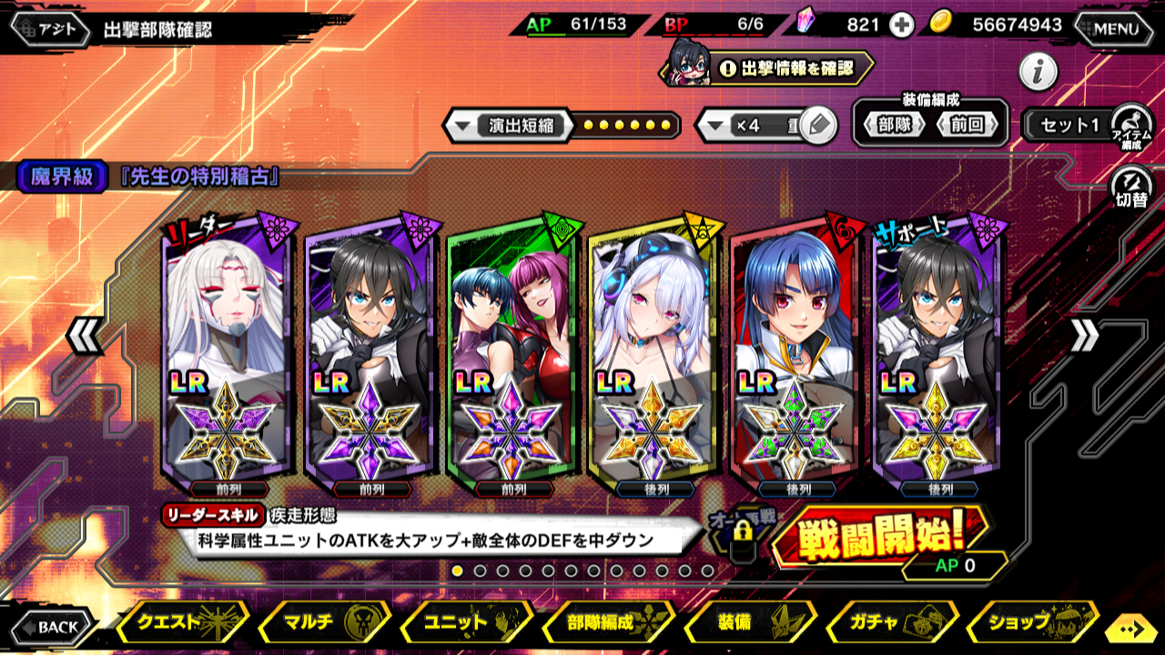 ▲スキルシートの変更だけでいけるかとも思ったが、ステータスが上がる前の速攻が重要そう。なのでバフ解除役を【疾走形態】鬼壱あずさ(特性:対魔忍持ち)に変更して、さらに攻撃的に