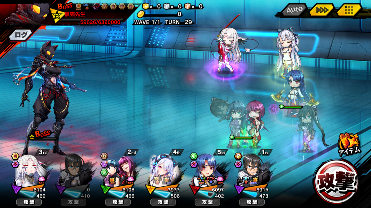 ▲初期はDEFが400台しかないため、天音CQCの奥義で16万点入り、ガンガンHPが削れる。リーダースキルを攻撃的にしたぶん味方が死にやすくなったが、適宜HP回復薬を使ったり、蘇生石で起こしたりして、29ターンにトドメ。この時点でDEFが1600台まで上がっているので、やはり火力が大切だ。ポイントはバフデバフの消去と、対魔忍アタッカーの用意。サポートはデバフ解除と防御役を兼ねる天音CQC(サポートは後衛なので都合よくCQC動転輪モード)をおススメする