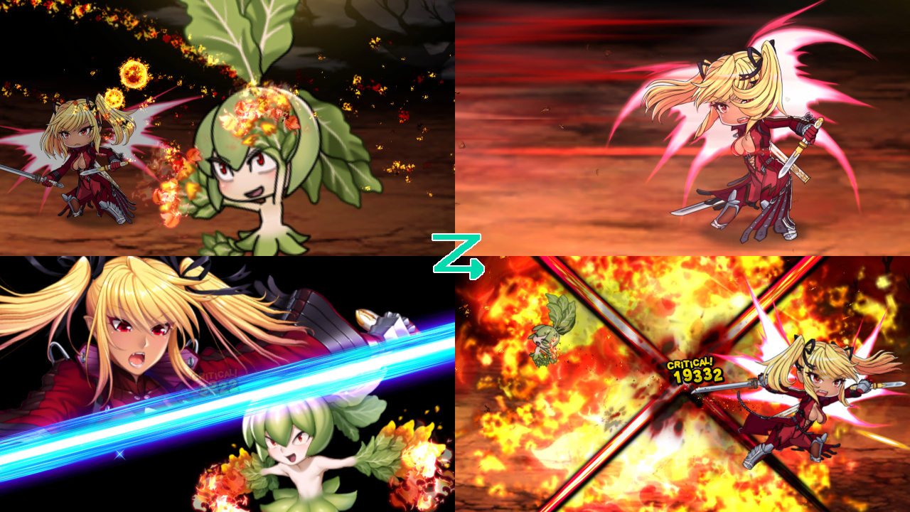 奥義(モードチェンジ中):自身にATK&会心ダメージの対魔忍特性バフ付与、単体攻撃(自身SPDが高いと威力アップ)+自身にダメージ+ターン終了時、味方全体に与ダメージアップ付与