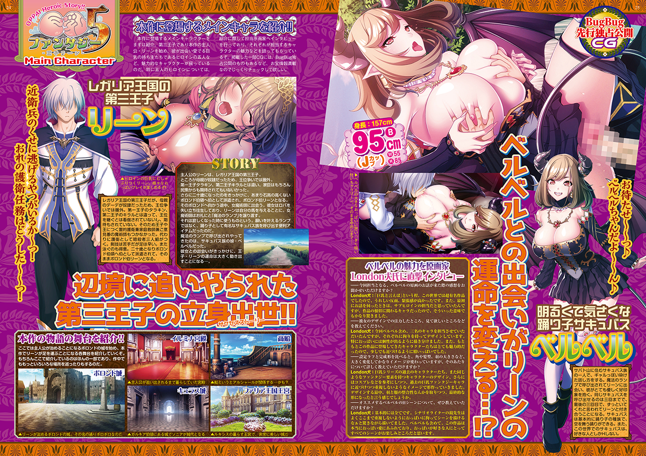 おっぱい星人大注目のWaffle看板シリーズ最新作『巨乳ファンタジー5 ~王子リーン~』を総力特集!! 人気シナリオライター・鏡裕之氏が綴るサクセスストーリー&巨乳エロの見所を、どこよりも早く詳しく紹介。『巨乳ファンタジー』シリーズならではのおっぱいにこだわりまくった迫力ビジュアルの数々はもちろん、独占公開CGやシナリオプレビュー、さらには原画家陣へのインタビュー等々。ここでしか読めない独占情報も満載の巻頭カラー12ページで徹底紹介だ!!