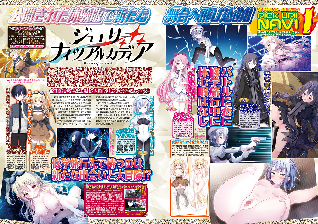 きゃべつそふと期待の新作『ジュエリー・ナイツ・アルカディア -The ends of the world-』を今月もカラー6ページの特集記事で大プッシュ!! 2022年に発売され大好評だった『ジュエリー・ハーツ・アカデミア -We will wing wonder world-』の続編となる本作。主人公やヒロイン等の前作の主要キャラはそのままに、新キャラのヒロイン2名+昇格ヒロイン2名が追加され、新たな物語が紡がれるのだ。毎月掲載の冬茜トム氏による書き下ろしキャラ座談会も必読だぞ♪