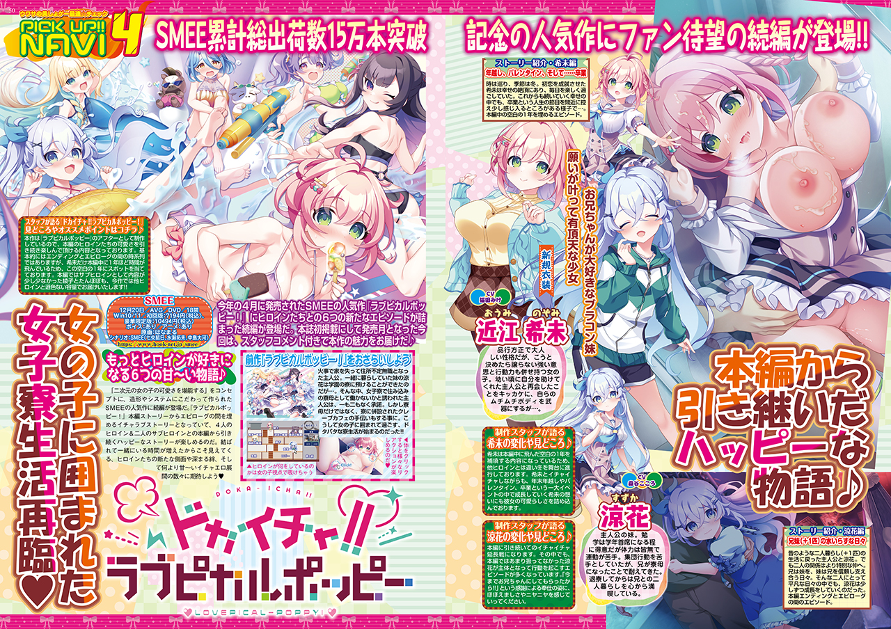 今年の4月にSMEEよりリリースされた、SMEE15周年&累計15万本突破記念作品『ラブピカルポッピー!』に、早くもファンディスク『ドカイチャ!! ラブピカルポッピー!』が登場!! 本編ストーリーからエピローグの間を埋めるイチャラブストーリーを描いた内容で、4人のヒロイン&2人のサブヒロインとのハッピーなストーリーが楽しめるのだ。本誌初紹介となる今回は、前作よりさらに濃厚なイチャエログラフィックも満載の、カラー4ページでお届けするぞ。