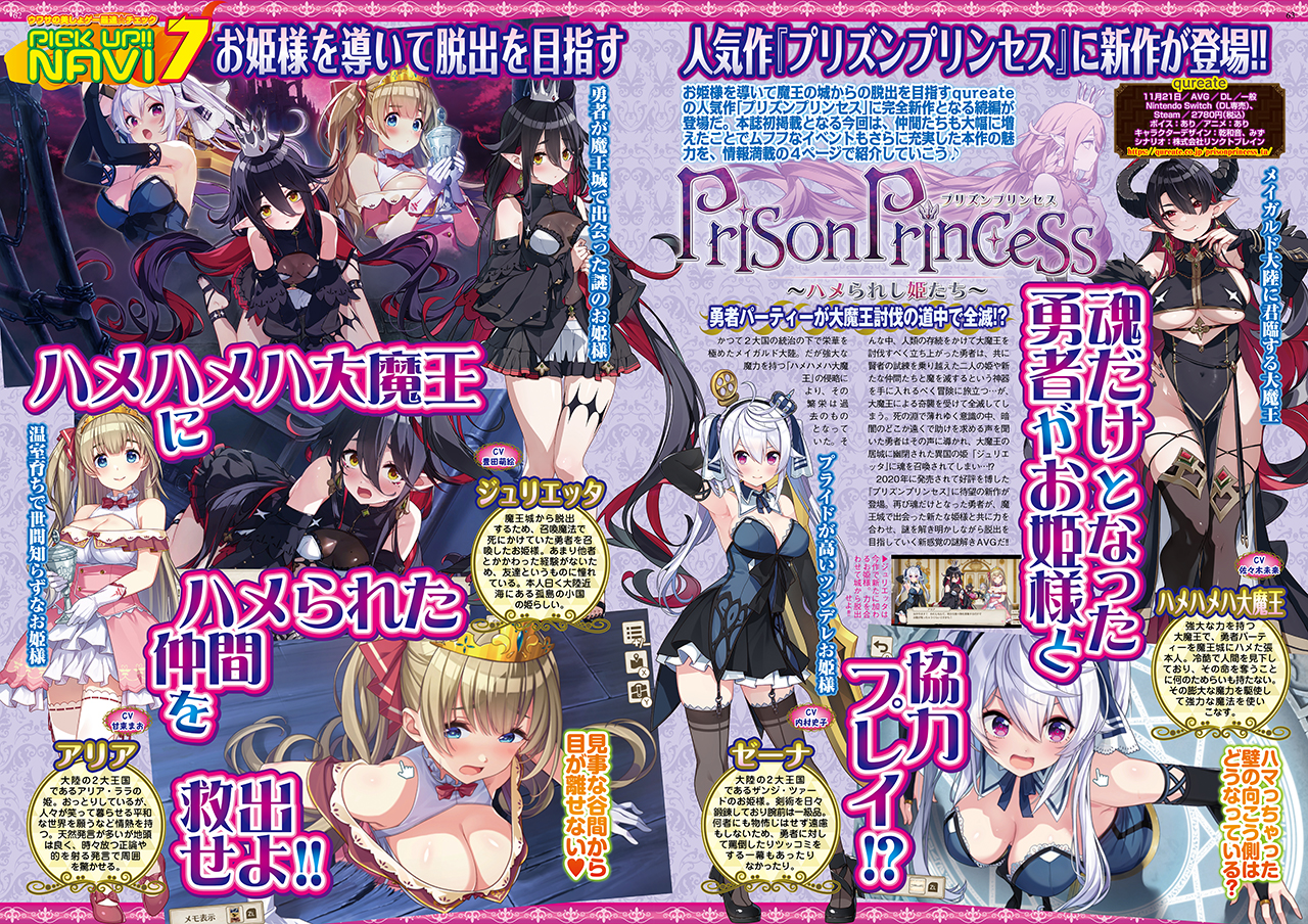 お紳士様向け恋愛AVG『バニーガーデン』が大バズりしたqureateから、新作『プリズンプリンセス ハメられし姫たち』が登場!! 本作は2020年に発売されて好評を博した『プリズンプリンセス』の完全新作となる続編。再び魂だけとなった勇者が、魔王城で出会った新たな姫様と共に力を合わせ、謎を解き明かしながら脱出を目指していく、新感覚の謎解きAVGになっている。一般作だけどそこはqureate、ムフフなCGも満載のカラー4ページで特集しているぞ♪