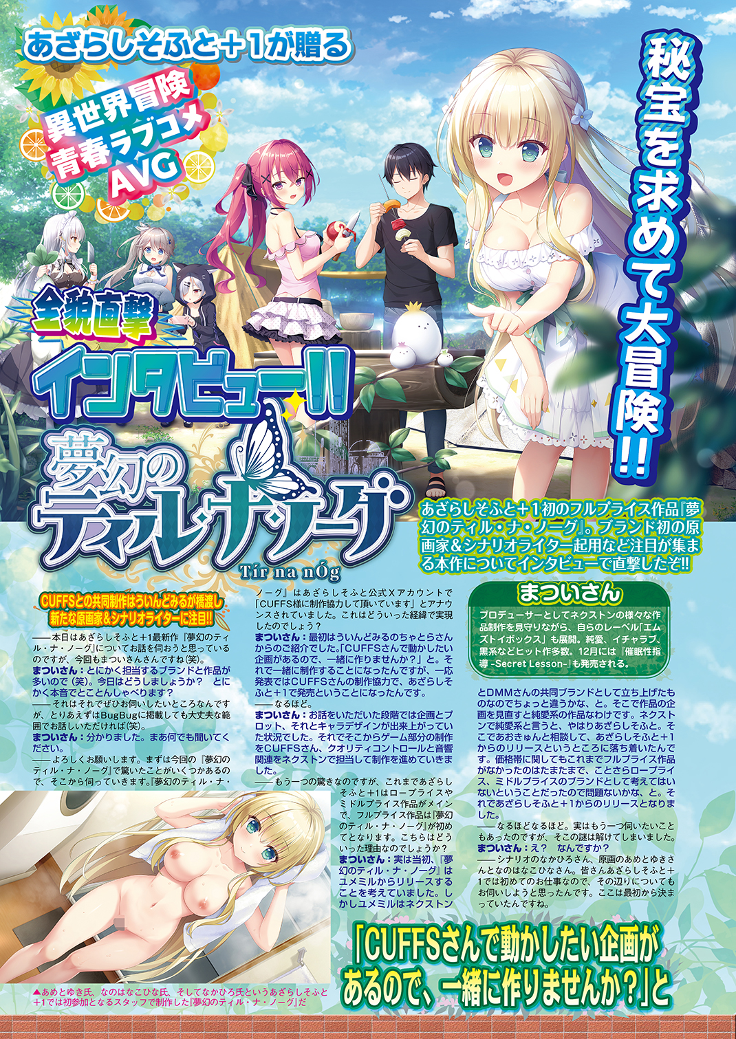 数々のヒット作を放つ人気ブランド・あざらしそふと+1より、初のフルプライス作品となる異世界冒険青春ラブコメAVG『夢幻のティル・ナ・ノーグ』。CUFFSとの共同制作やブランド初の原画家&シナリオライターの起用など、話題性も満載な本作にロングインタビューを敢行!! 企画が立ちあがった経緯や作品の見所など、プロデューサー・まついさん氏へカラー6ページに渡って直撃したぞ。今月は付録DVDでも本作を動画で大特集しているので合わせて楽しもう。