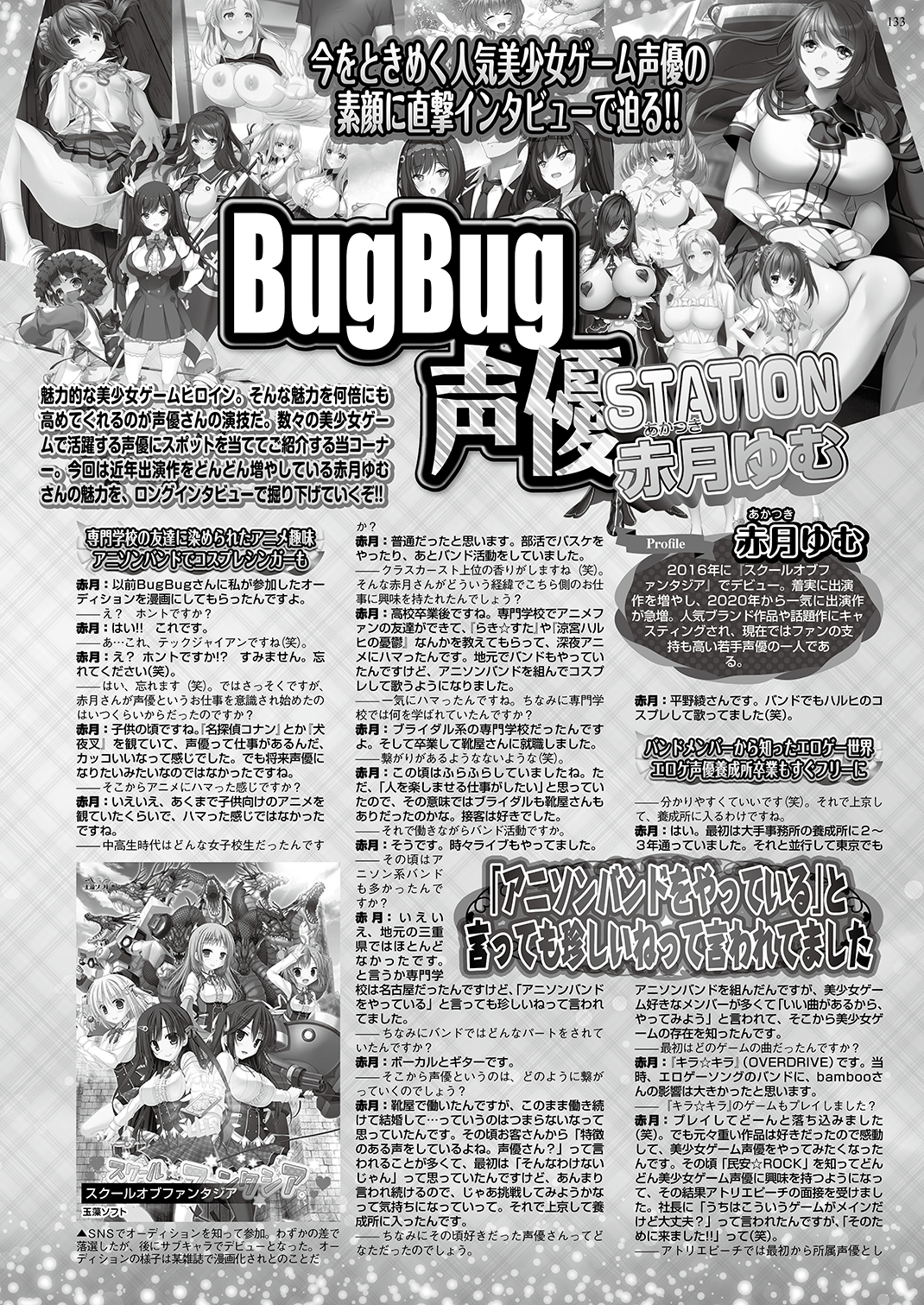 人気声優の素顔に迫るインタビューが大好評の「BugBug声優STATION」。今回は近年出演作をどんどん増やして人気も急上昇中な赤月ゆむさんが登場!! デビューまでの経緯や転機となった作品、収録時の様子やオフの過ごし方や今後やってみたい活動など、モノクロ7ページでたっぷり直撃したぞ。特にデビュー当時に某ショップで働きながら宣伝していた話は面白くて必読♪ 大好評の直筆サイン色紙のプレゼントもあるので、声優ファンならマストバイだ!!