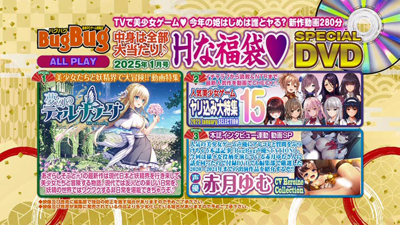最新美少女ゲームの見所を動画でHシーンもたっぷり見られて大好評なBugBug付録DVD。まず今月は誌面の読物特集と連動で『夢幻のティル・ナ・ノーグ』(あざらしそふと+1)を動画で大特集。ヒロイン4人のイチャエロHシーンも大収録しているぞ。もう一つの特集は「BugBug声優STATION」コーナーと連動し、人気声優・赤月ゆむさんが演じたヒロイン・10タイトルを厳選紹介。ヒロインごとの演技の違いがよく分かるのに加え、R18シーンも収録していて見応え満点!! そしてお馴染み「人気美少女ゲームヤリ込み大特集15」では、『オトメ世界の歩き方』(Orthros)、『ムーン・ゴースト』(Purple software)、『聖奴隷学園2 完全調教版』(Liquid)等、話題の15タイトルをHシーンも満載で大収録!!