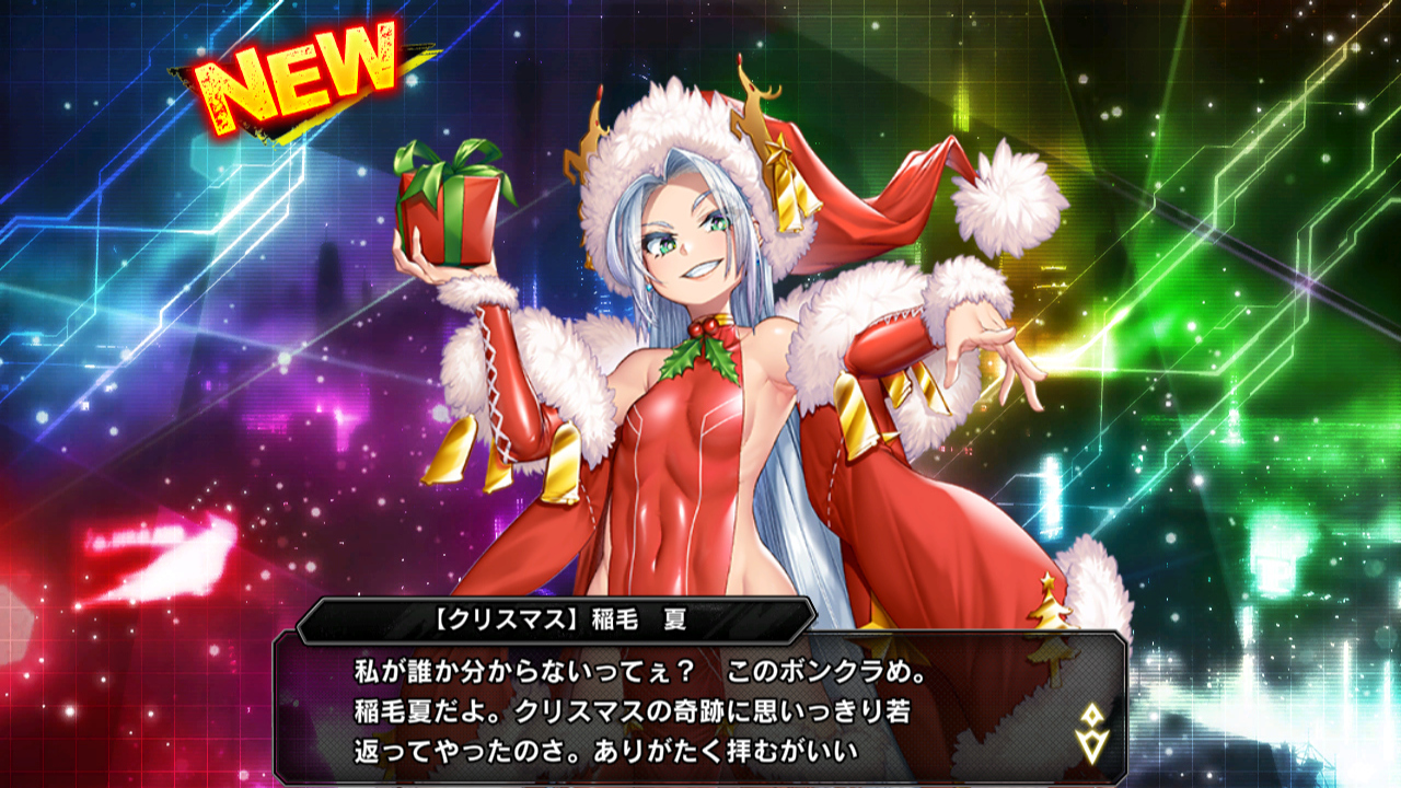▲"クリスマスは冬ごもり"の報酬はSR【クリスマス】稲毛夏。目の錯覚ではなく、実際にいつもよりロリロリしている。気合を入れた魂遁の術で若返りすぎた状態だ。ユニットとしてはサンタコスが基本だが、シナリオ中では対魔忍スーツに羽織を引っ掛けた姿も見せてくれる