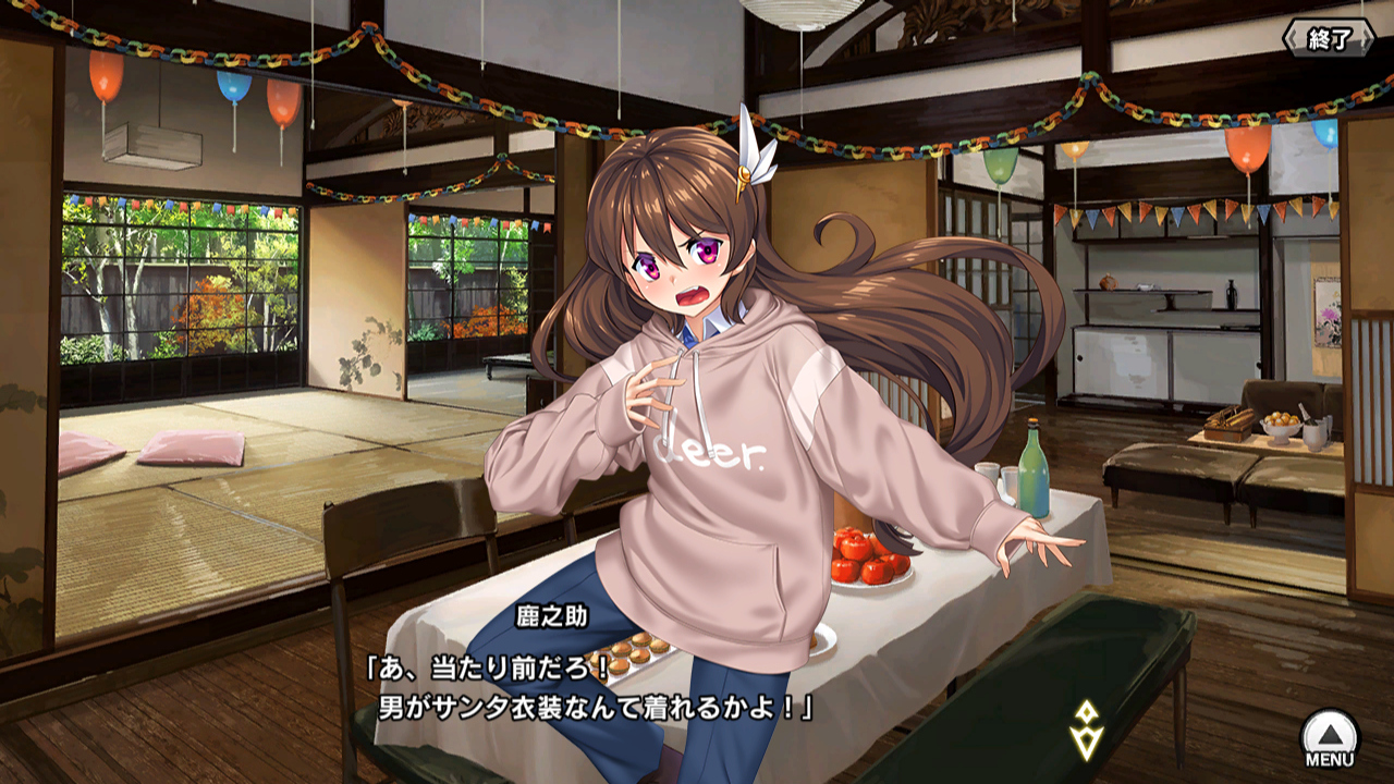 ▲サンタコスがない鹿之助は制服の上にパーカーを着た冬服差分を作ってもらっている。小太郎からは「サンタは男だろ」とツッコまれていた。「皆がサンタコスのなかでむしろ目立っていて姑息。男だからと油断ならない」とは、磯咲伊紀の弁