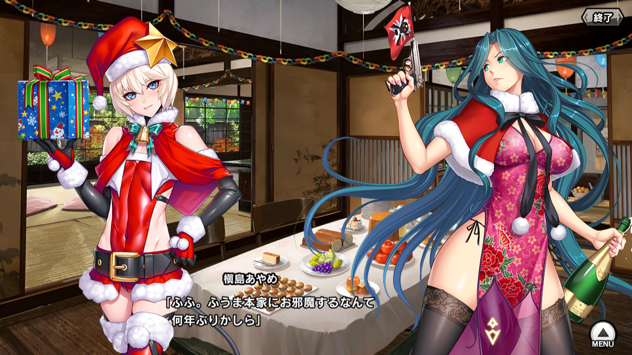 ▲なお先輩とあやめさん。クリスマスユニットがないあやめさんは、【単独潜入】槇島あやめの差分。最近、ノマドでお姫様扱いになって身動きが取れない紅の代理にしては、格好が浮かれすぎじゃないだろうか。シャンパンも開いてるし……。その後の酔い方を見るに、あやめさんはあやめさんで愛する主と一緒の時間が減って(かがりちゃんはずっと一緒なのに)ストレスが溜まっているようだ