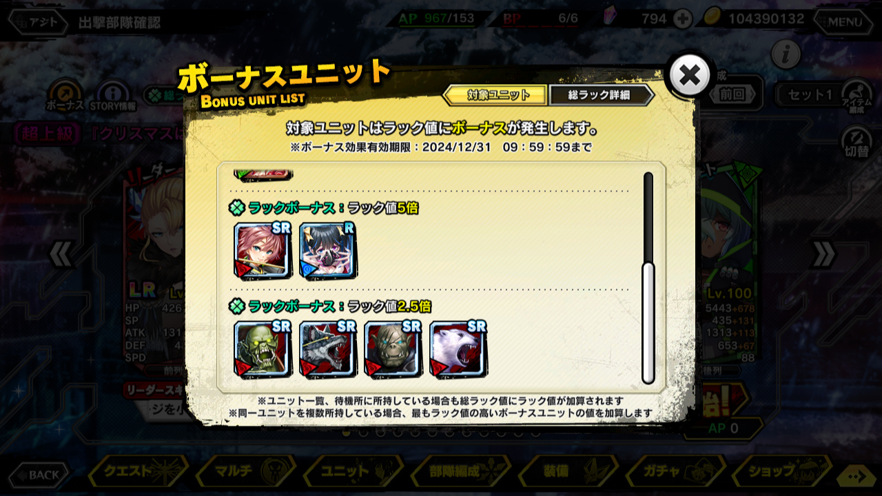 ▲ボーナスユニットは「現在のガチャの新規ユニット」と、「前回イベントの報酬SR」、「現イベントボスに対して有利な属性の決戦ユニット」の3種類。それ以外に総ラックには、部隊編成ユニットのラックも足される。こだわる場合は、編成を「ボーナスユニットではないラック100のユニット」にした方が総ラックは高くなるが、基本的に総ラックが501あればいいため、あまり気にする必要はない