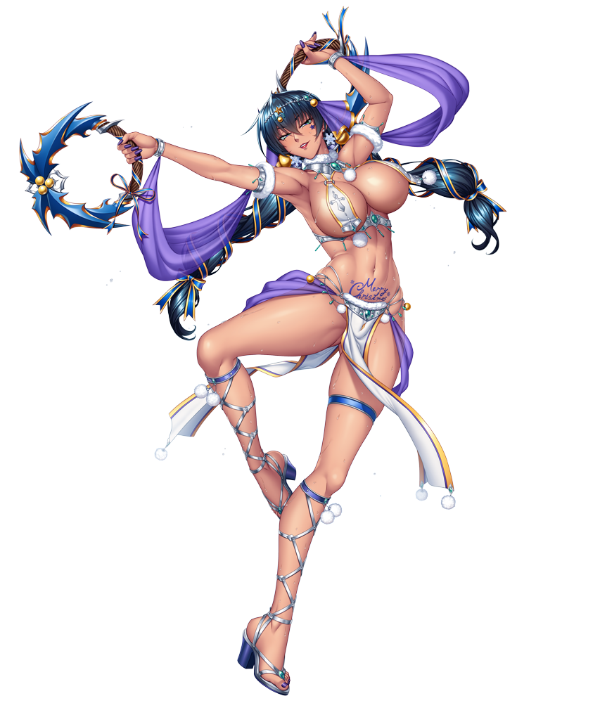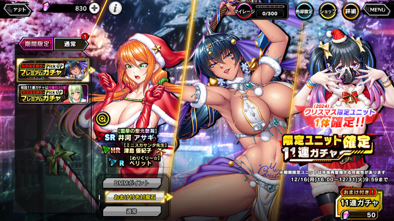 ガチャから引けた時はもちろん、SR【雪華の聖光艶舞】井河アサギをご紹介。日焼け肌に薄着もいいところだが、一応、クリスマスモチーフみたいのは各所に入っているし、お腹にメリークリスマスと書いてある。アサギさんの肉体美はもちろん、相反する2要素をまとめたデザイン力がすごい。
