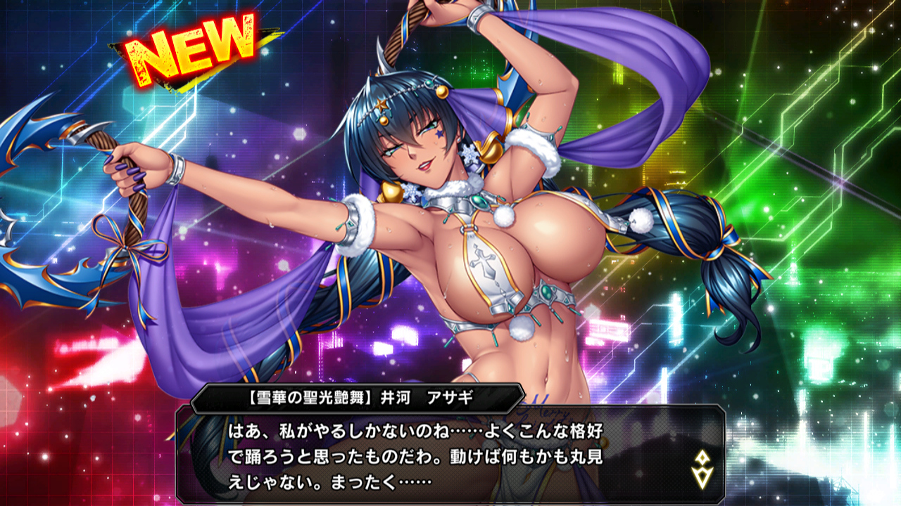▲対魔忍総隊長、五車学園校長、最強の対魔忍と、多くの肩書を持つ五車の指導者。超人的な剣術、体術と、超高速化する忍法、奥の手の魔族化、何より正義を貫く強い意志力と冷徹な判断力で無類の強さを誇る。クリスマスも仕事で忙しいが、予定がなくても一緒に出掛けるパートナーはいない。イベントと違い、プロフィールによるとこの格好は集団催淫事件の囮捜査のためのもの