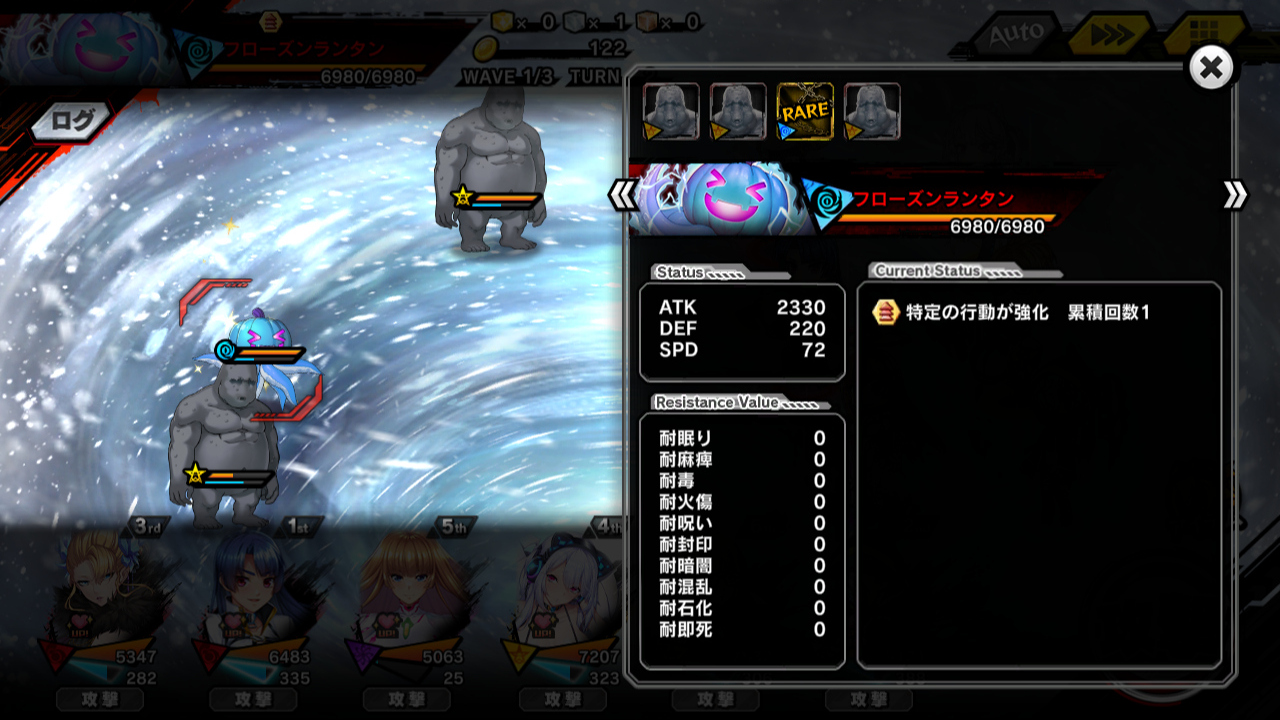 ▲ボスはファントムドラゴン。最初に氷結(状態異常耐性&行動順ダウン)を与えてくるが、HPが17万しかないため、その後にどんな状態異常を使うのか謎なまま死んでいく。火傷耐性が低いけど、殴ってダメージで倒したほうが早い