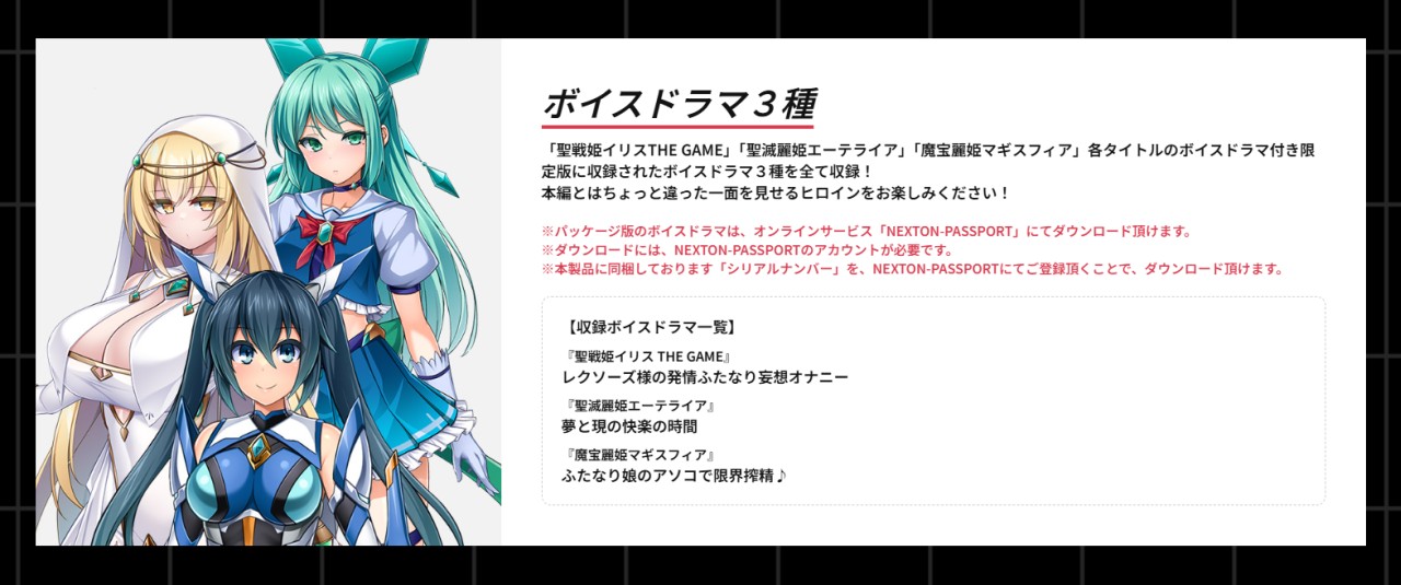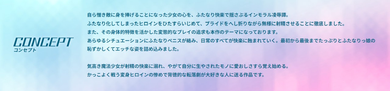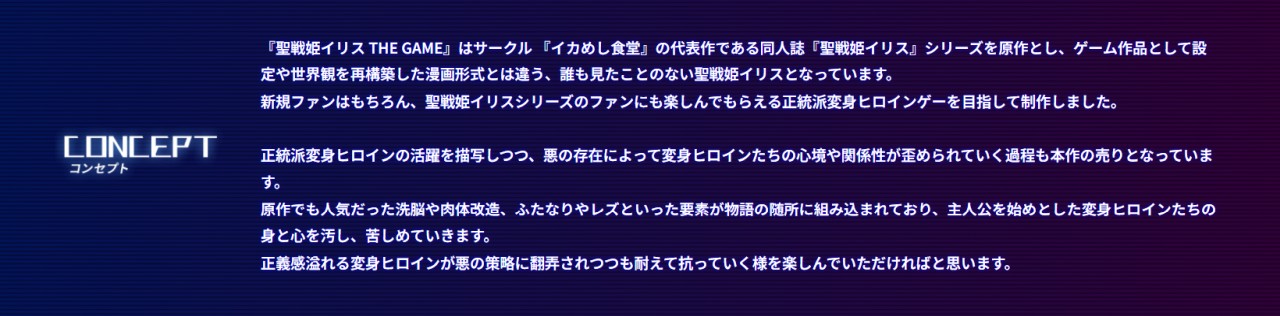 収録タイトルは、人気サークル“イカめし食堂” の大人気同人誌『聖戦姫イリス』シリーズを原作とした『聖戦姫イリス THE GAME』、現代社会を舞台にシスターのような格好に変身して戦う『聖滅麗姫エーテライア』、なんと変身ヒロインがふたなり化してプライドをへし折られながら絶頂射精させられまくる『魔宝麗姫マギスフィア』、以上の3本。