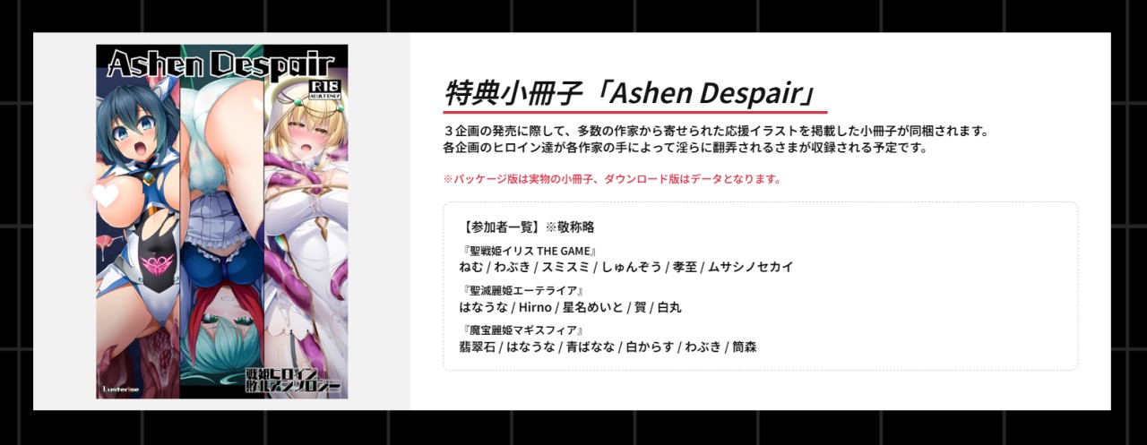 だが『戦姫ヒロイン敗北アンソロジー』購入した場合は、ボイスドラマ付きDL版を個別に購入するより価格が安いだけではなく、さらに多数の作家から寄せられた応援イラストが掲載される小冊子「Ashen Despair」(DL版の場合はデータ)が特典として付属するという、非常にお得なパッケージとなっている。