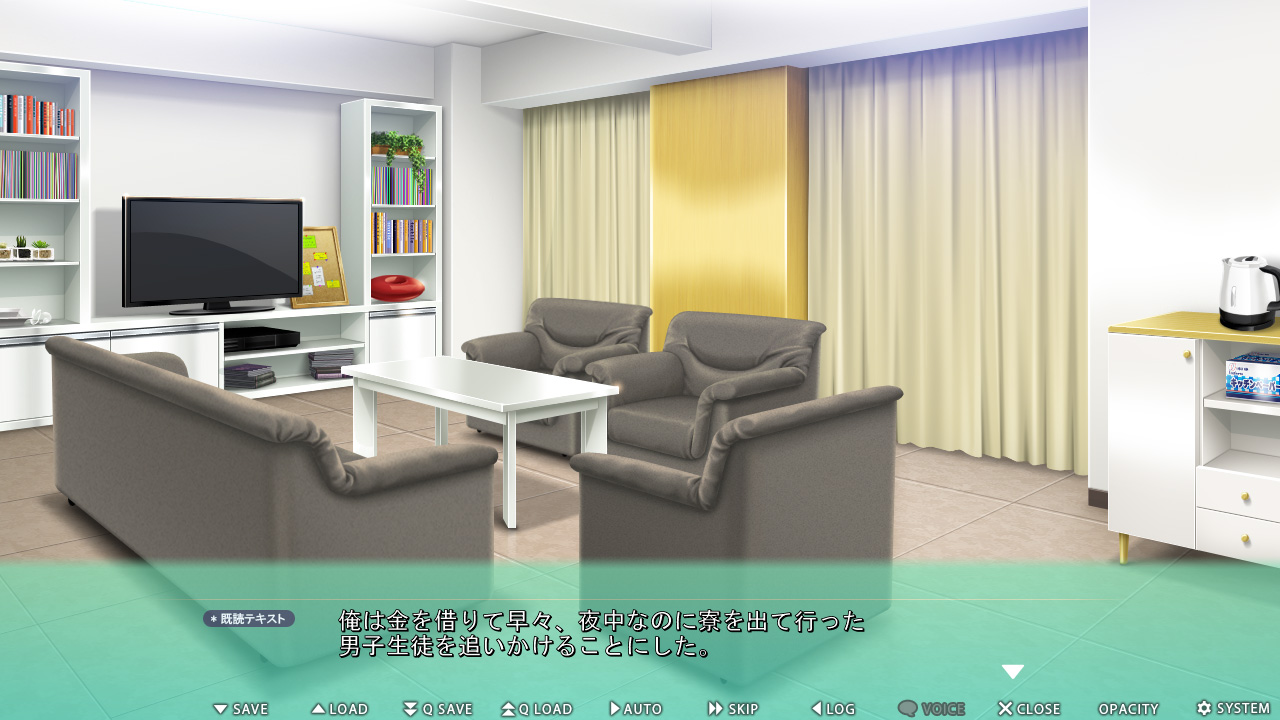▲平穏な学園生活を過ごしていた主人公。ある夜、男子学園生から金を貸して欲しいと頼まれるが…