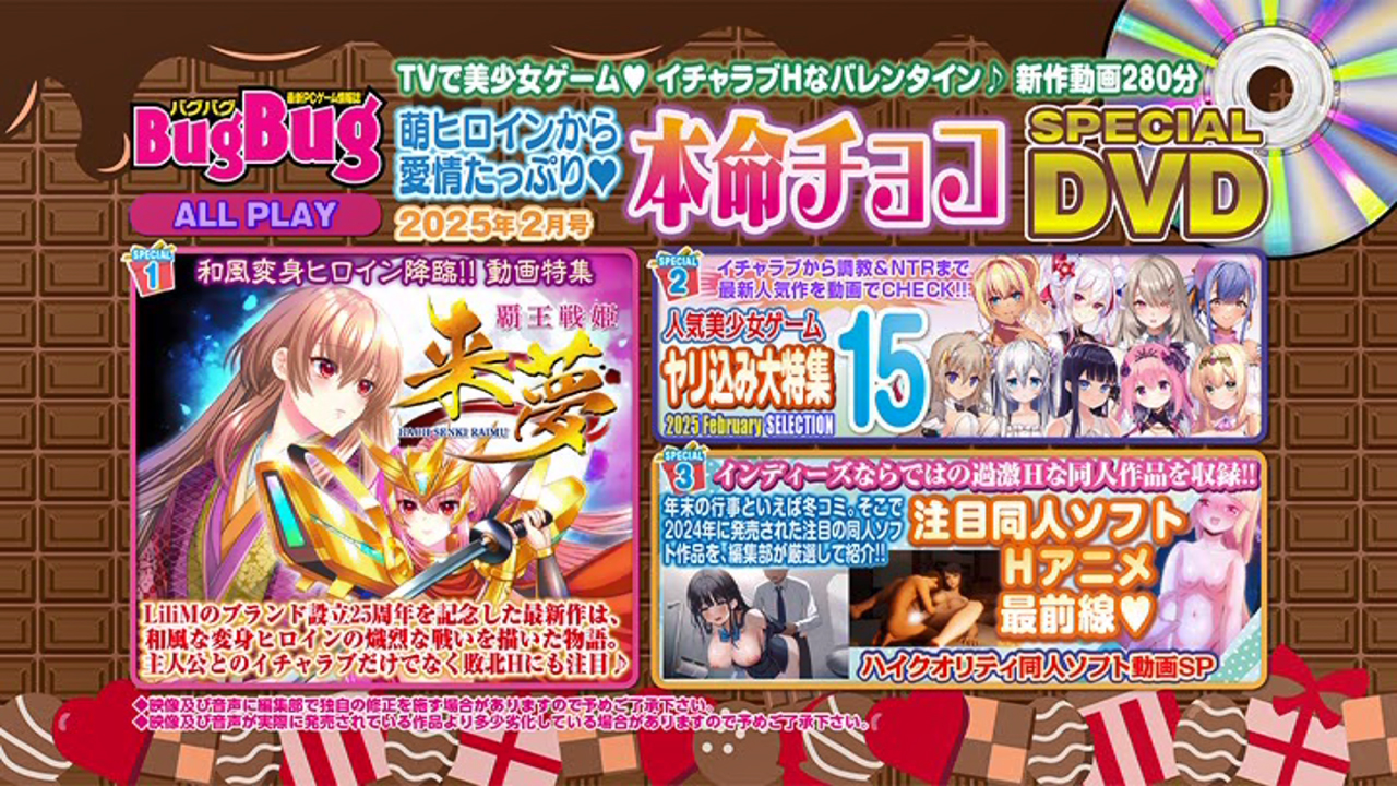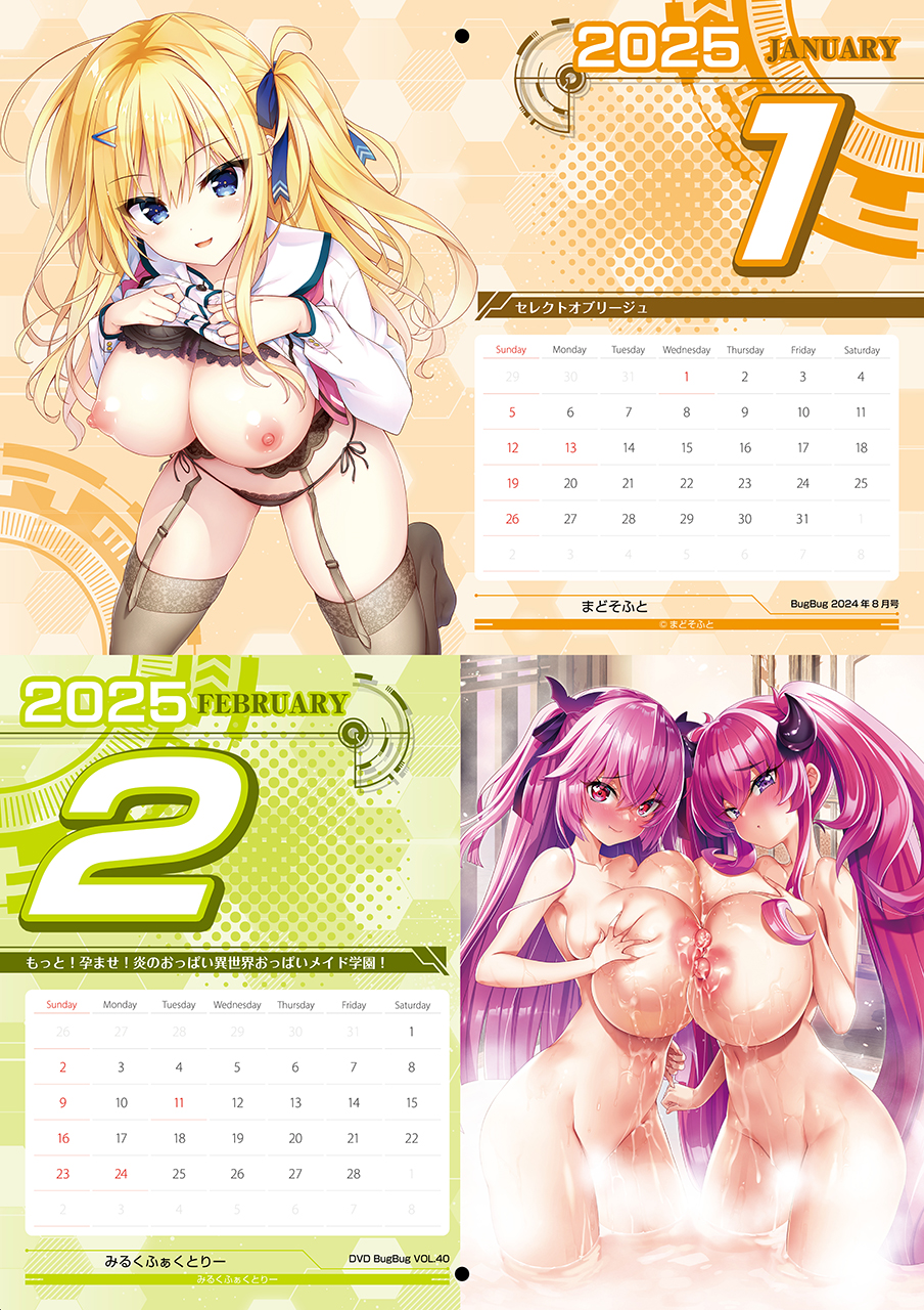 昨年大好評だった別冊付録カレンダーが再び登場!! 今回はBugBugの表紙に加えDVD BugBugやBugBug.NEWSの表紙や付録なども加えた12作品の描き下ろしイラストからベストセレクトして、2025年のカレンダーにして付録でお届けするぞ。収録作は、『セレクトオブリージュ』(まどそふと)、『もっと!孕ませ!炎のおっぱい異世界おっぱいメイド学園!』(みるくふぁくとりー)、『フタマタ恋愛』(ASa Project)、『アンラベル・トリガー』(Archive)、『旭光のマリアージュ』(ensemble)、『オトメ世界の歩き方』(Orthros)、『あまいろショコラータ3』(きゃべつそふと)、『真・恋姫†英雄譚4』(BaseSon)、『シークレットラブ(仮)』(HOOKSOFT)、『恥辱の制服2』(BISHOP)、『悠刻のファムファタル』(エスクード)、『きまぐれテンプテーション2 ゆうやみ廻奇譚』(シルキーズプラスWASABI)、以上の12作品だ。今回も壁掛け用の穴が開いているので、部屋に飾って一年中楽しめるぞ。