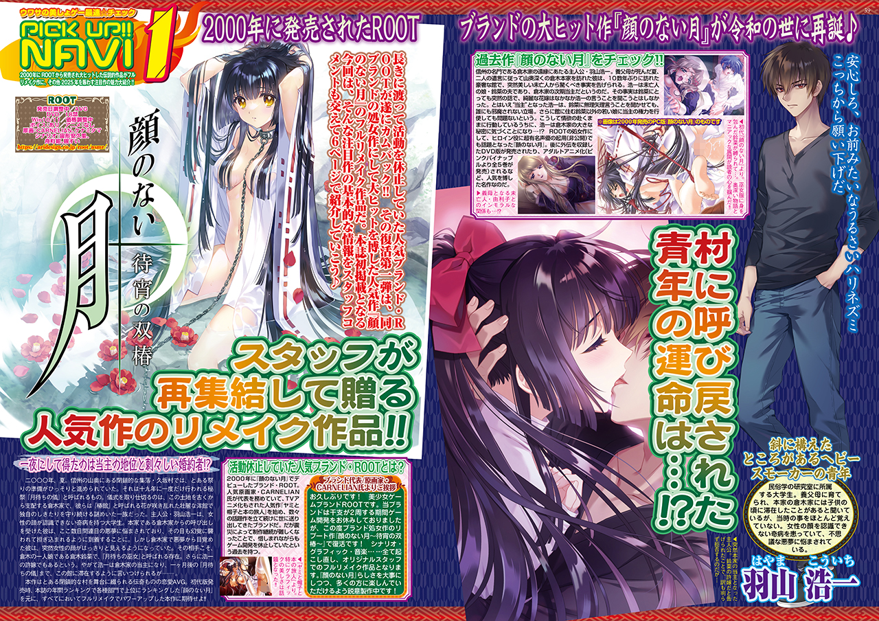 長きに渡って活動を休止していたブランド・ROOTが待望のカムバック!! 気になる復活第一弾は、同ブランドの処女作にして大ヒット作のフルリメイク『顔のない月 -待宵の双椿-』。クラウドファンディングで初期目標2000万円の倍以上4600万円を達成、追加の第2弾でも最終的に1700万円に達したのも話題だったのだ。本誌初掲載となる今回は、ブランド代表にして原画家でもあるCARNELIAN氏と、シナリオライター・宙形安久里氏のコメントも掲載。内容盛り沢山カラー6ページで大特集だ。