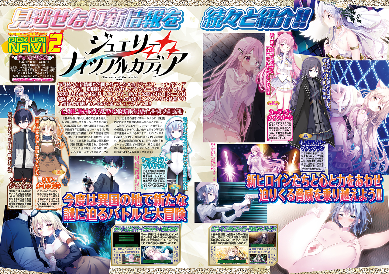 毎月続々と新情報が公開されているきゃべつそふとの話題作『ジュエリー・ナイツ・アルカディア』を、今月もカラー6ページで大特集!! 人気作『ジュエリー・ハーツ・アカデミア』の続編で、新ヒロインも登場するなど、新たな物語が紡がれる本作。大好評で連載中のシナリオ・冬茜トム氏による書き下ろしキャラ座談会は、今回はキャロライナをピックアップ♪ 他にも新たに公開されたHシーン体験版やサウンドアルバムの紹介など、注目情報満載でお届けしているぞ。