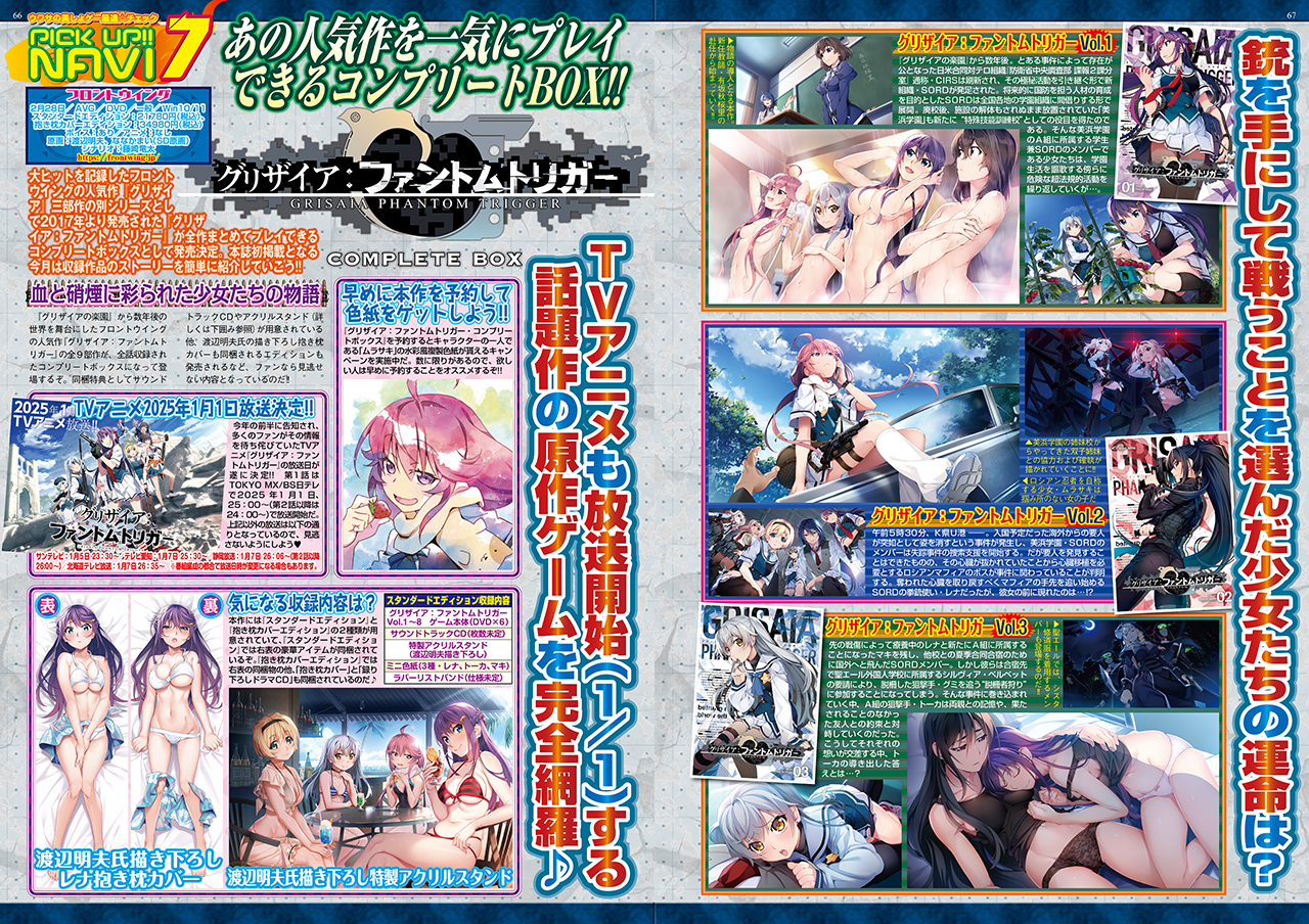 大ヒットを記録したフロントウイングの人気作『グリザイア』三部作の別シリーズとしてリリースされた『グリザイア:ファントムトリガー』全9作が、コンプリートボックスとして登場!! 2025年1月1日からTVアニメが放送されるのも話題沸騰中の本作。今回のコンプリートボックスでは、同梱特典としてサウンドトラックCDやアクリルスタンドが用意されてる他、渡辺明夫氏の描き下ろし抱き枕カバーも同梱される豪華エディションもご用意。『グリザイア』ファンなら絶対欲しい決定版だ!!