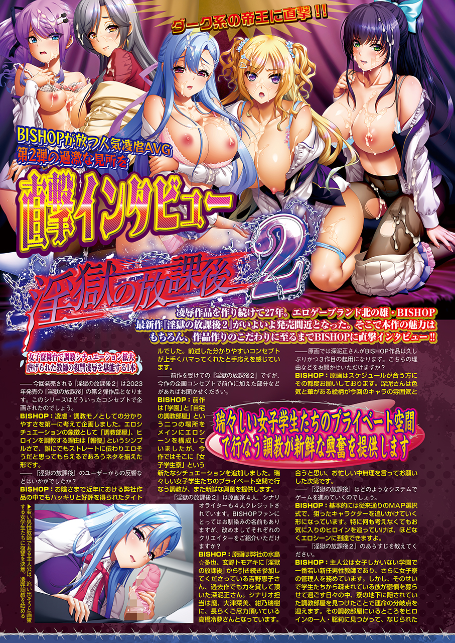 ダーク系美少女ゲームの帝王・BISHOPが放つ人気凌虐AVG第2弾『淫獄の放課後2』の過激な見所を徹底ロングインタビュー!! 女子寮と学園を舞台にした淫辱劇が描かれる本作について、ヒロインの魅力や調教シチュエーションのポイント、4:3のグラフィックにこだわる理由など、様々な切り口で深掘りしているぞ。さらに北の地でダーク系を作り続けて27年を迎える老舗ブランドだけに、黒系美少女ゲームや北海道メーカーの最新事情なども直撃。盛り沢山のカラー6ページになっているぞ。