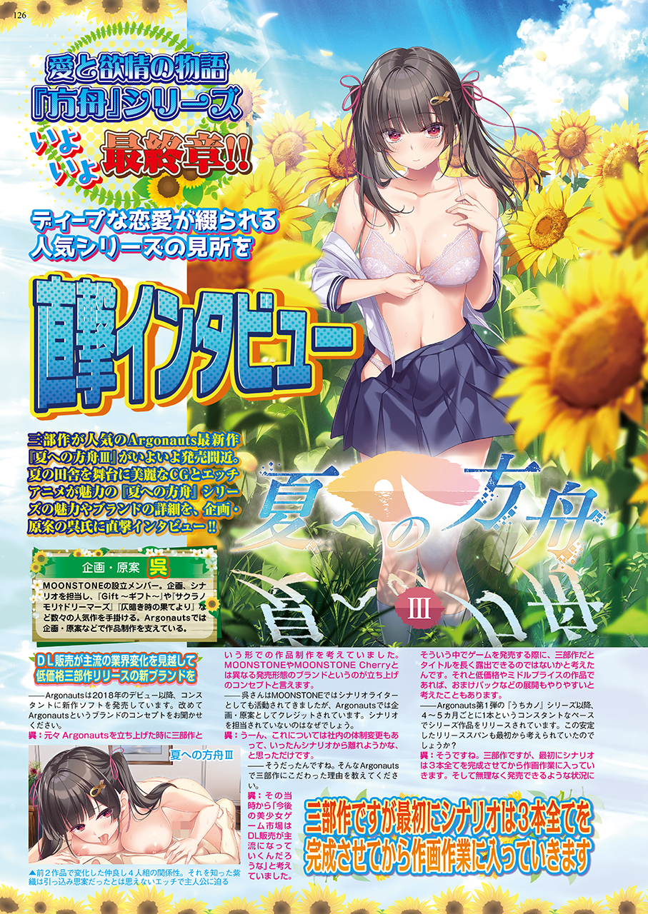夏の田舎を舞台に愛と欲情の物語が綴られる、Argonautsの人気シリーズ『夏への方舟』。その最終章となる『夏への方舟Ⅲ』を中心に、シリーズの見所を企画・原案の呉氏にロングインタビュー!! 『夏への方舟』についてはもちろん、ブランドの過去作についてや、新たに搭載したアニメHについてなど、盛り沢山のカラー6ページでお届けしているぞ。最後はArgonauts、MOONSTONE、MOONSTONE Cherryの新作予定についても飛び出す、美少女ゲームファン必読のインタビューだ!!