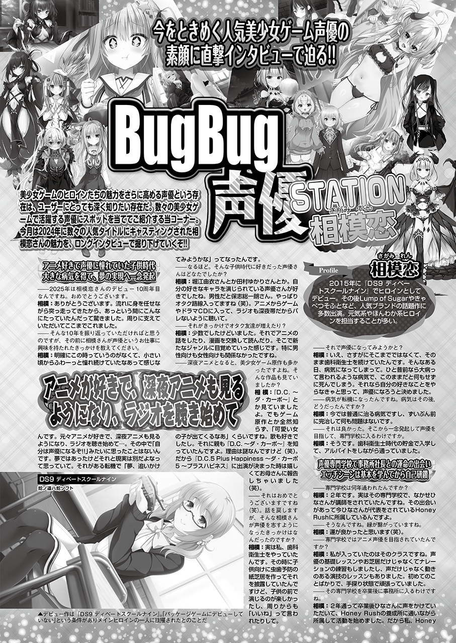 人気声優の素顔に迫る赤裸々インタビューが大好評な「BugBug声優STATION」コーナー。今回は元気系やほんわか系ヒロインに定評のある声優・相模恋さんにロングインタビュー!! 今年でデビュー10周年を迎え、人気ブランドの話題作に次々出演している相模恋さん。声優デビューを果たすまでの経緯や、転機となった作品、オフの過ごし方や、今後やってみたいお仕事…等々、気になるアレコレを7ページに渡って徹底調査!! 恒例の直筆サイン色紙のプレゼントも要チェック♪