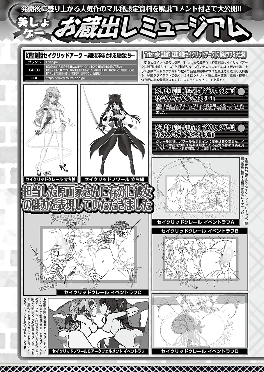 発売後に盛り上がる人気作のマル秘設定資料を解説コメント付きで深掘り紹介していく「美しょゲーお蔵出しミュージアム」。今回はブランドの人気作がクロスオーバーして話題沸騰中の変身ヒロインAVG『幻聖剣姫セイクリッドアーク』の秘密をお蔵出し!! まずは秘蔵ラフイラストの数々をスタッフコメント付きで特別公開。さらにシナリオ・野山風一郎氏&原画・斎藤なつき氏への直撃インタビューも掲載し、発売後ならではの6ページで深堀り徹底紹介だ。