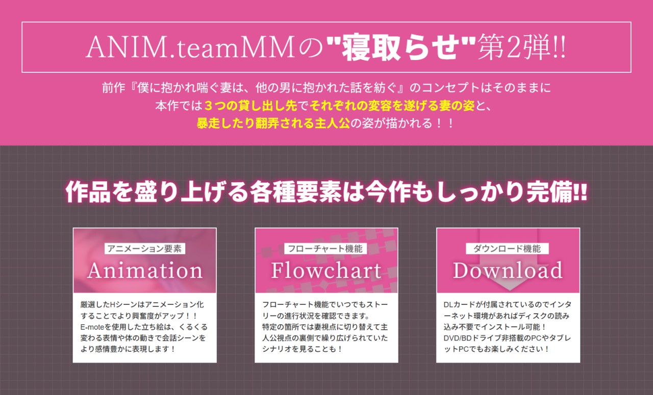 ANIM作品でお馴染みのE-motoの立ち絵とアニメHは本作でも搭載。大迫力&臨場感抜群で味わえる極上の寝取らせエロスに期待大だ!!