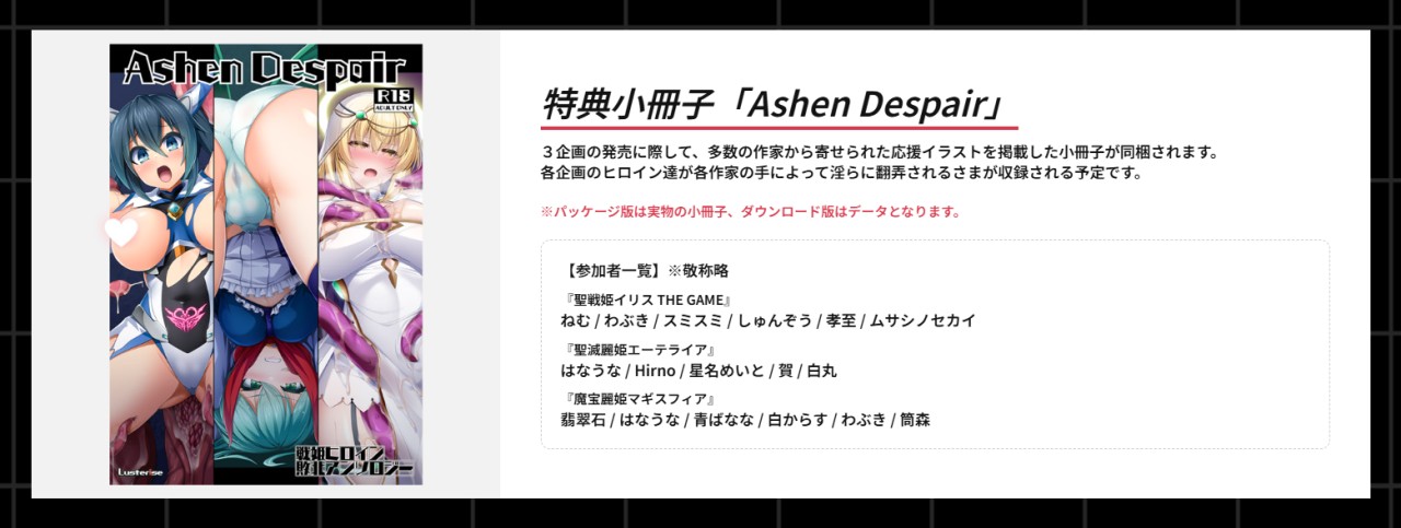 さらに、多数の作家から寄せられた応援イラストが掲載される小冊子「Ashen Despair」(DL版の場合はデータ)が特典として付属。こちらは単品購入では入手できないので、欲しい人は『戦姫ヒロイン敗北アンソロジー』を選んで購入しよう!!