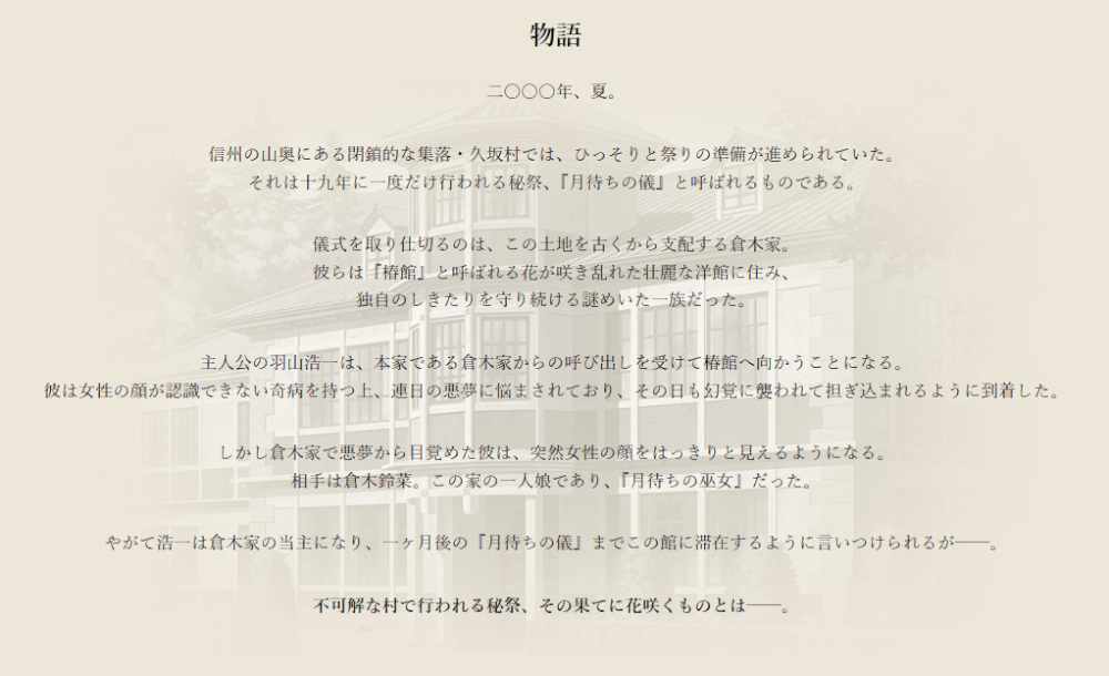 『顔のない月』は閉鎖的な村を舞台に綴られる、伝奇恋愛AVGだ。2000年の発売当時は、人気絵師・CARNELIAN氏の美しいグラフィックを筆頭に爆発的ヒットを記録。本誌BugBugの年間ランキング各部門を席巻するなど、名作の呼び声が高い作品だ。