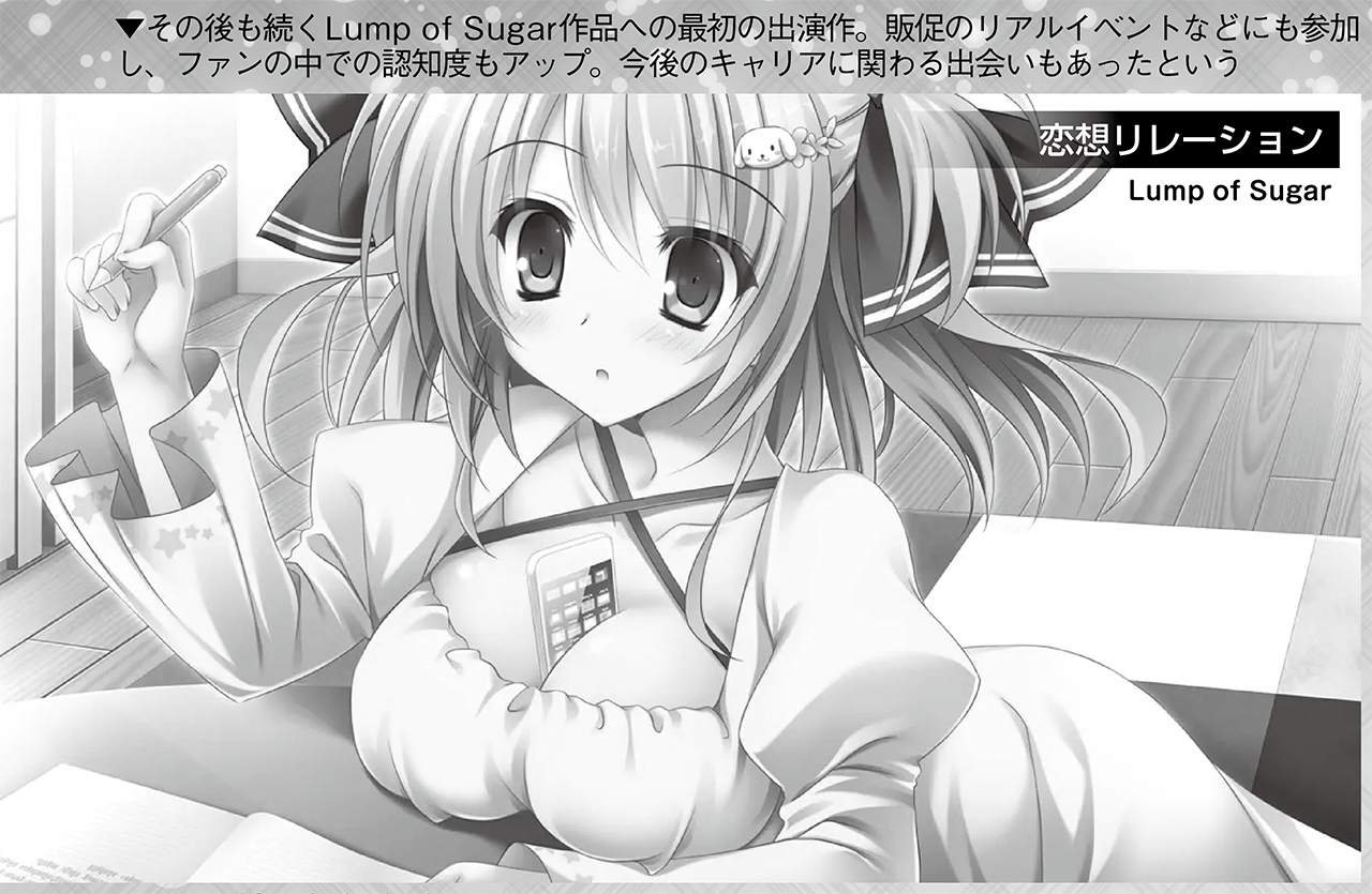 相模:最初に『恋想リレーション』(Lump of Sugar)です。人気ブランドの作品というのももちろんですが、この作品で初めてイベントに参加したんです。地方も回ったんですが、実は私それまで関東をあまり出たことがなかったんですよ。初めての九州、初めての飛行機ということで、ワクワクしつつビビりつつ(笑)。まだ美少女ゲームの世界自体、何も知らない時期だったというのもありますね。それでも作品やブランドのファンの方と直接会うことができましたし、コミケにも初めて参加できたりと、沢山の経験をつめた作品でした。実は自分の担当キャラが初の抱き枕カバーになったのも『恋想リレーション』の陽葵ちゃんが初めてなんですよ。これも嬉しかったですね。