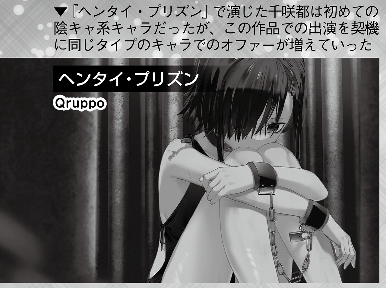▲感情の起伏が小さいキャラは苦手な相模さんにとって『ヘンタイ・プリズン』(qruppo)の千咲都は難しいキャラだったという。だがこの仕事以降、隠キャ系ヒロインの仕事が増えることに