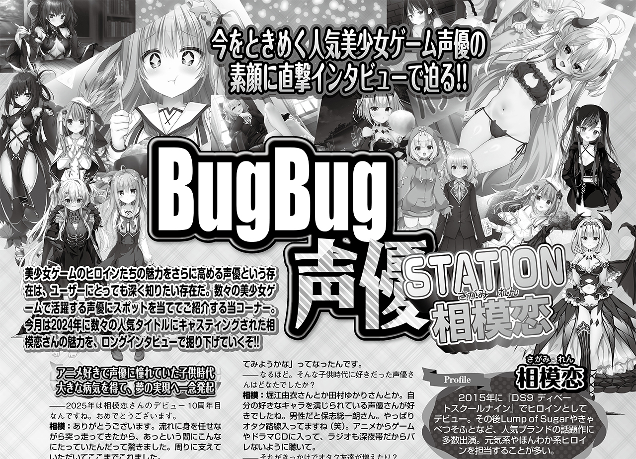 BugBug2月号では2024年に数々の人気タイトルにキャスティングされた相模恋さんが登場!! 全7ページのロングインタビューとなった、みんな気になるその内容。その一部をここで紹介しよう。