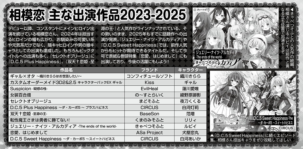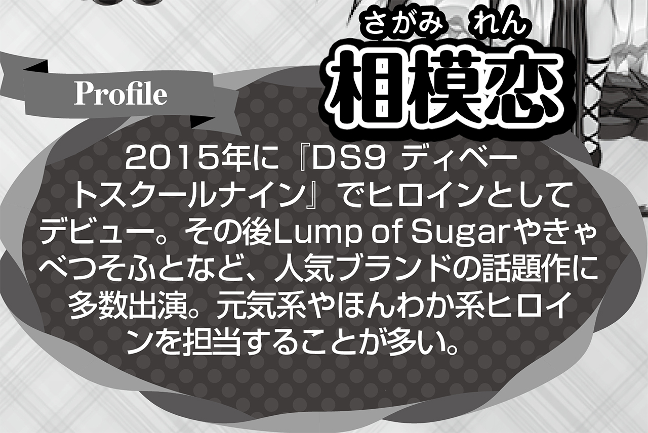 相模:私が好きなことをしながらここまでやってこれたのは応援して下さる皆さんがいてくれてこそで、いつも温かい言葉に励まされています。ありがとうございます。皆さんの推しや嫁の声をこれからも担当できたらと思っていますので、応援していただけたら嬉しいです。美少女ゲーム、一緒に楽しんでいきましょう。