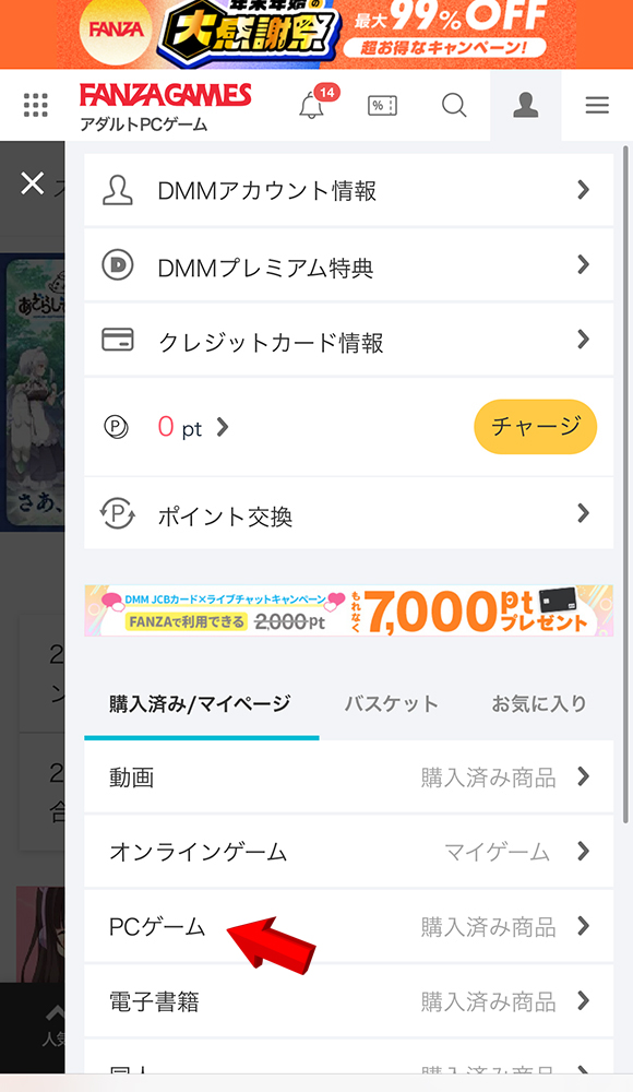 ▲購入手続きが完了したら、DMMアカウント情報内の赤い矢印が指す「PCゲーム」をタップ。リストに本作が登録されていれば、無事に購入完了した証だ