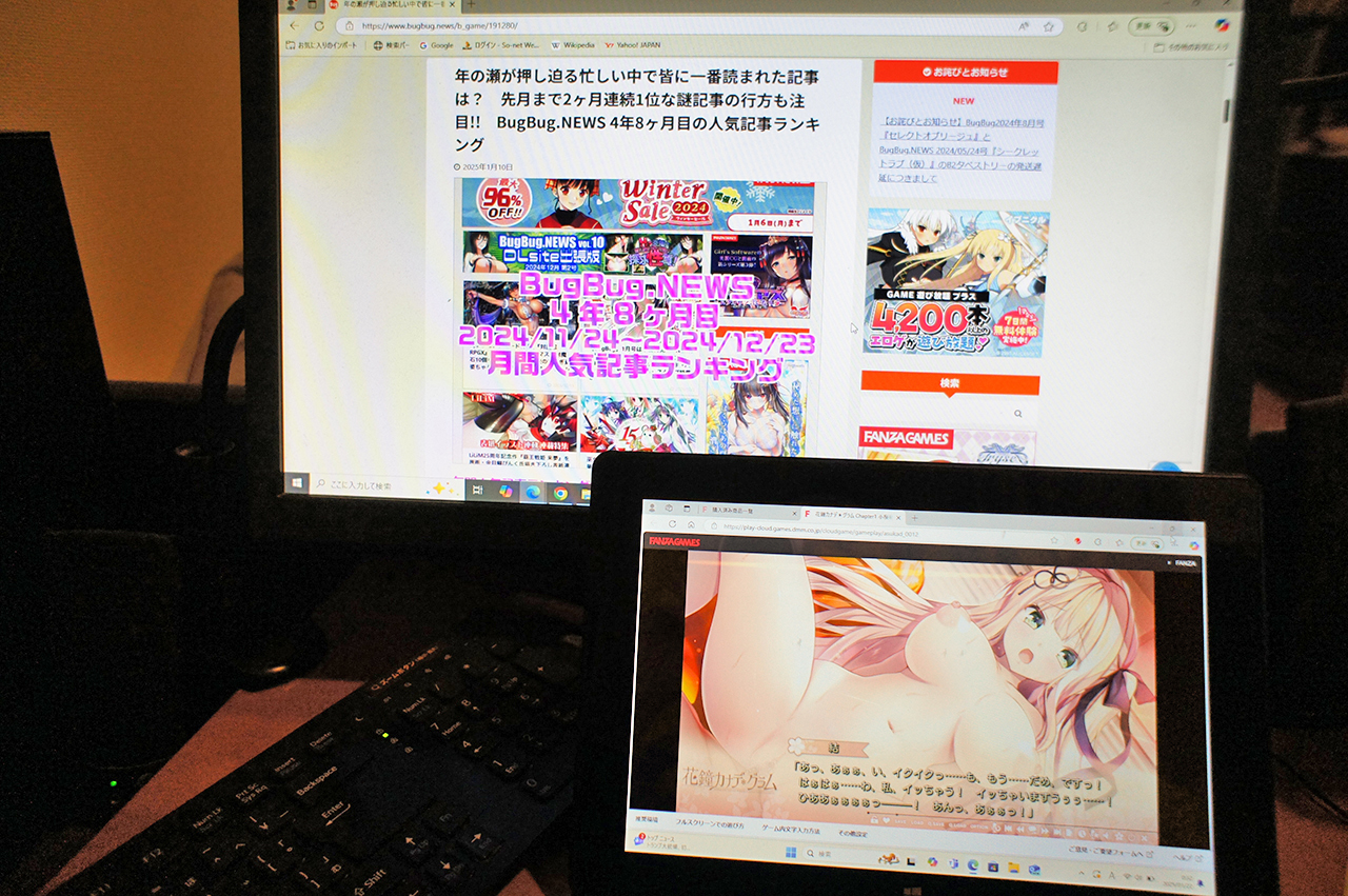 ▲自宅作業の合間、どうしてもヌキたくなってタブレットを取り出しエロシーンを堪能♥ ブラウザ版は異なるデバイス間でもセーブデータが共有できて便利なのだ