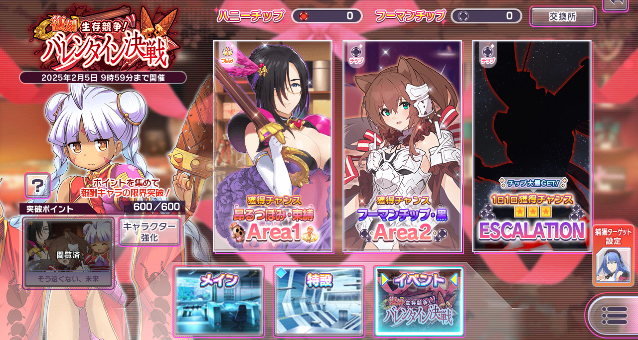▲『【復刻】生存競争! バレンタイン決戦』のイベント形式は昨年と異なり「昂るつぼみ・束縛」を集めて報酬キャラと交換するスタイル。昨年クリア済みの人は「フーマンチップ・黒」をメインに集めよう