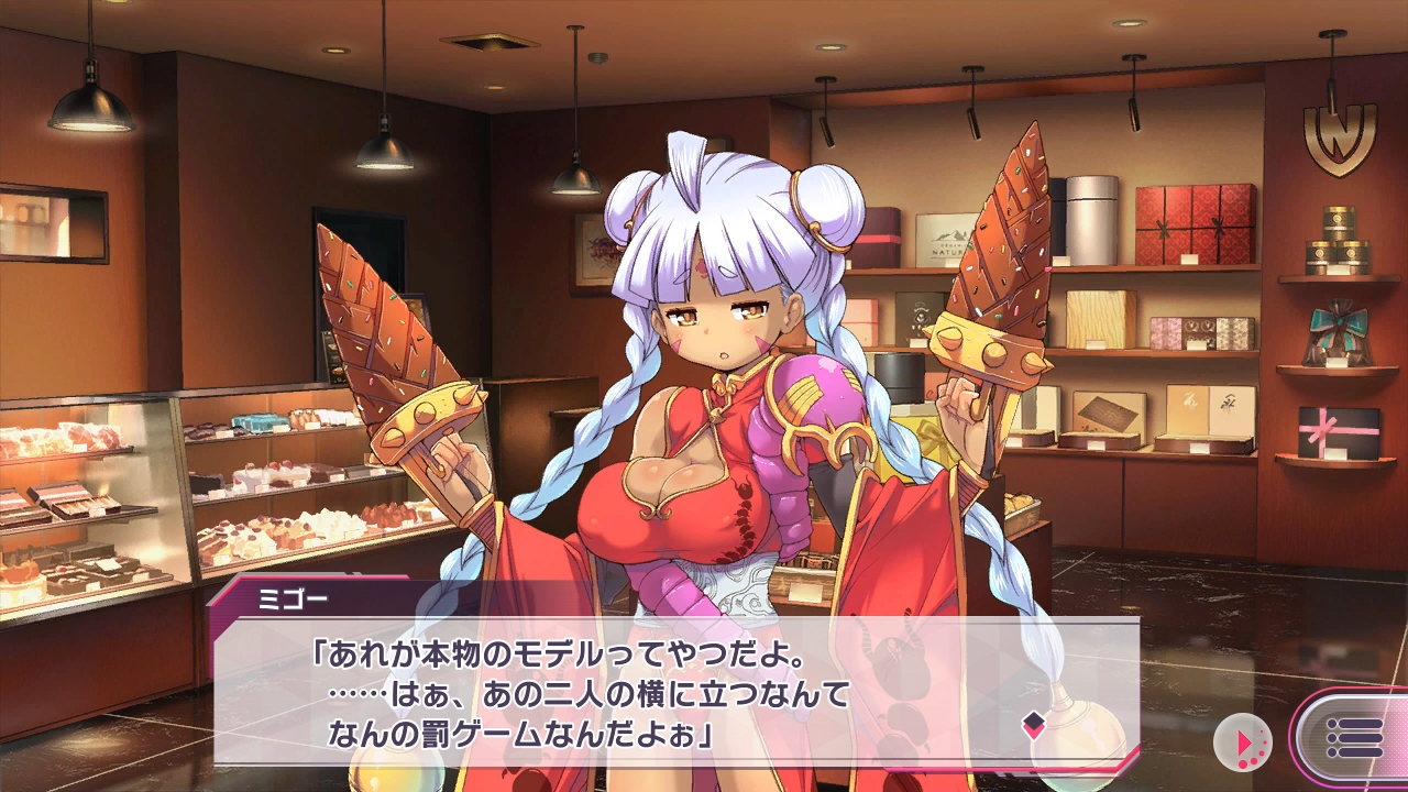 ▲厄災の能力から身を守るバリアを浴びたなりゆきで、デザイナーのミゴーも新商品のイメージガールをすることに。だが納得いってない様子