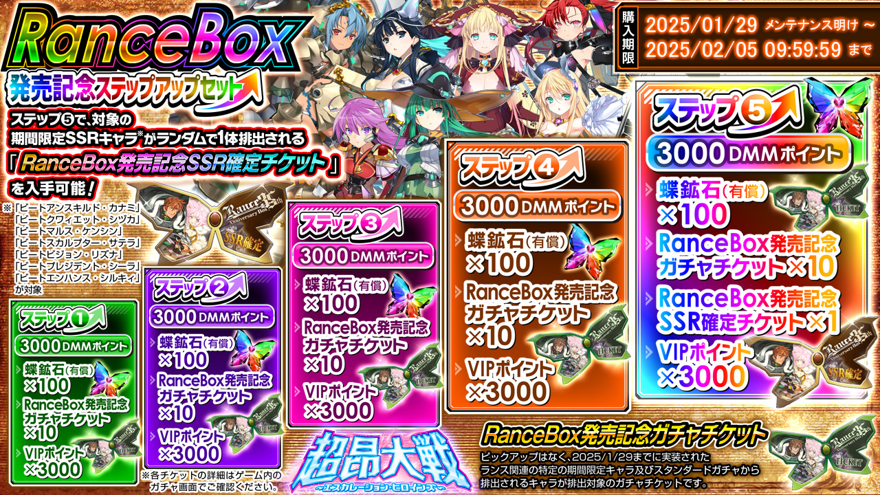 特に『RanceBox発売記念ステップアップ』は、すでにガチャの期間が終了したキャラも対象になっているので、どうしても欲しかった人にとってはチャンス延長といったところだろう。