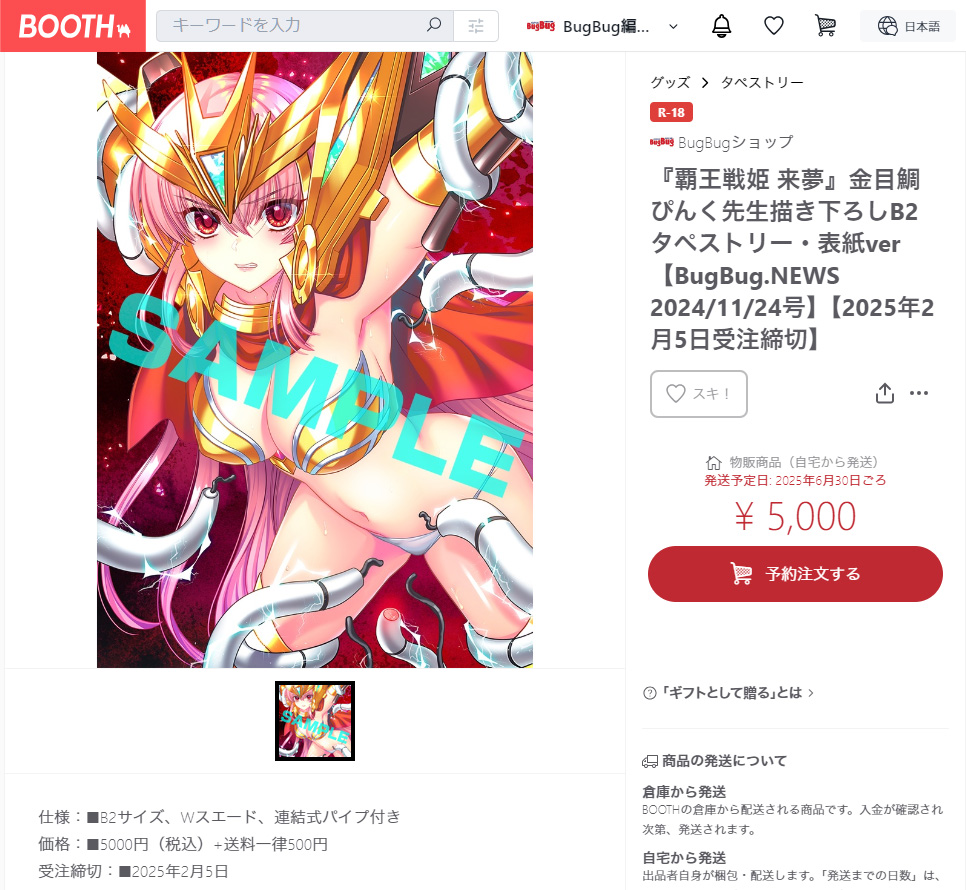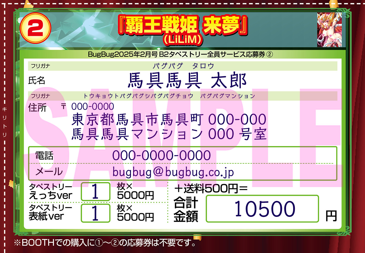 今回の『覇王戦姫 来夢』B2タペストリー2種類の応募〆切は、BOOTH・【BugBugショップ】も現金書留&応募券も、明後日2025年2月5日(水)いっぱいまで。