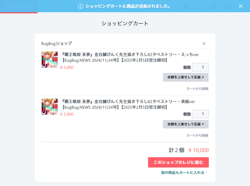 価格はBOOTHと同じく1枚あたり5000円で、送料は何枚購入しても500円。なので同じ種類のタペストリーを複数枚購入する場合は、一度にまとめて買った方がお得になっているぞ。