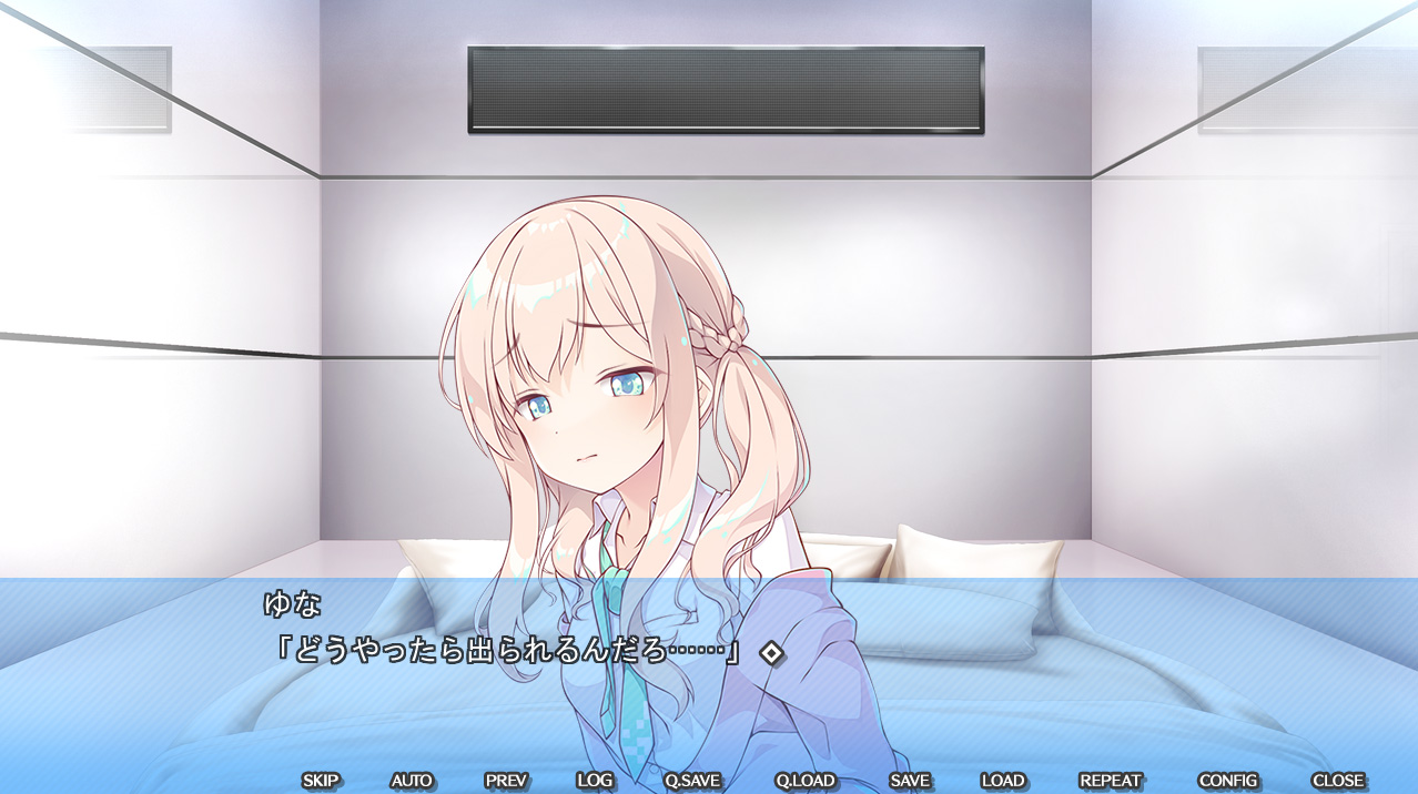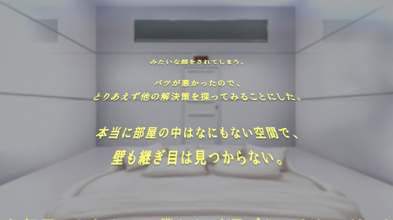 あるのは真っ白い壁とベッドだけ、ほかはなにもない部屋に閉じ込められた状況。