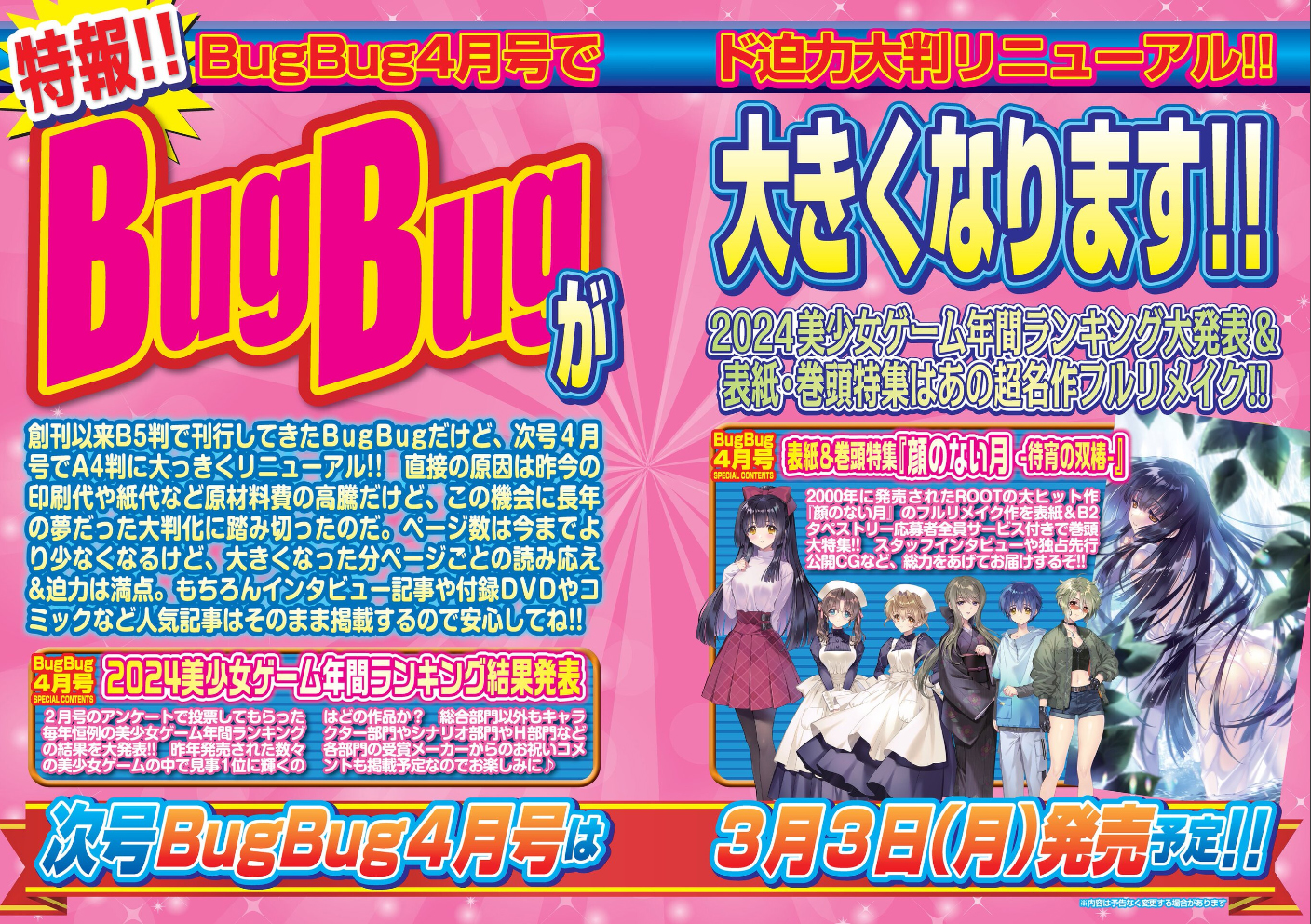 ▲3月3日発売の4月号でA4判にリニューアルする特報記事も試し読みで丸ごと見られちゃう。なお4月号は表紙&巻頭特集でROOTの『顔のない月 -待宵の双椿-』を取り上げるのに加え、「読者が選ぶ!! 美少女ゲーム2024年間ランキング」も掲載予定なのでお楽しみに♪