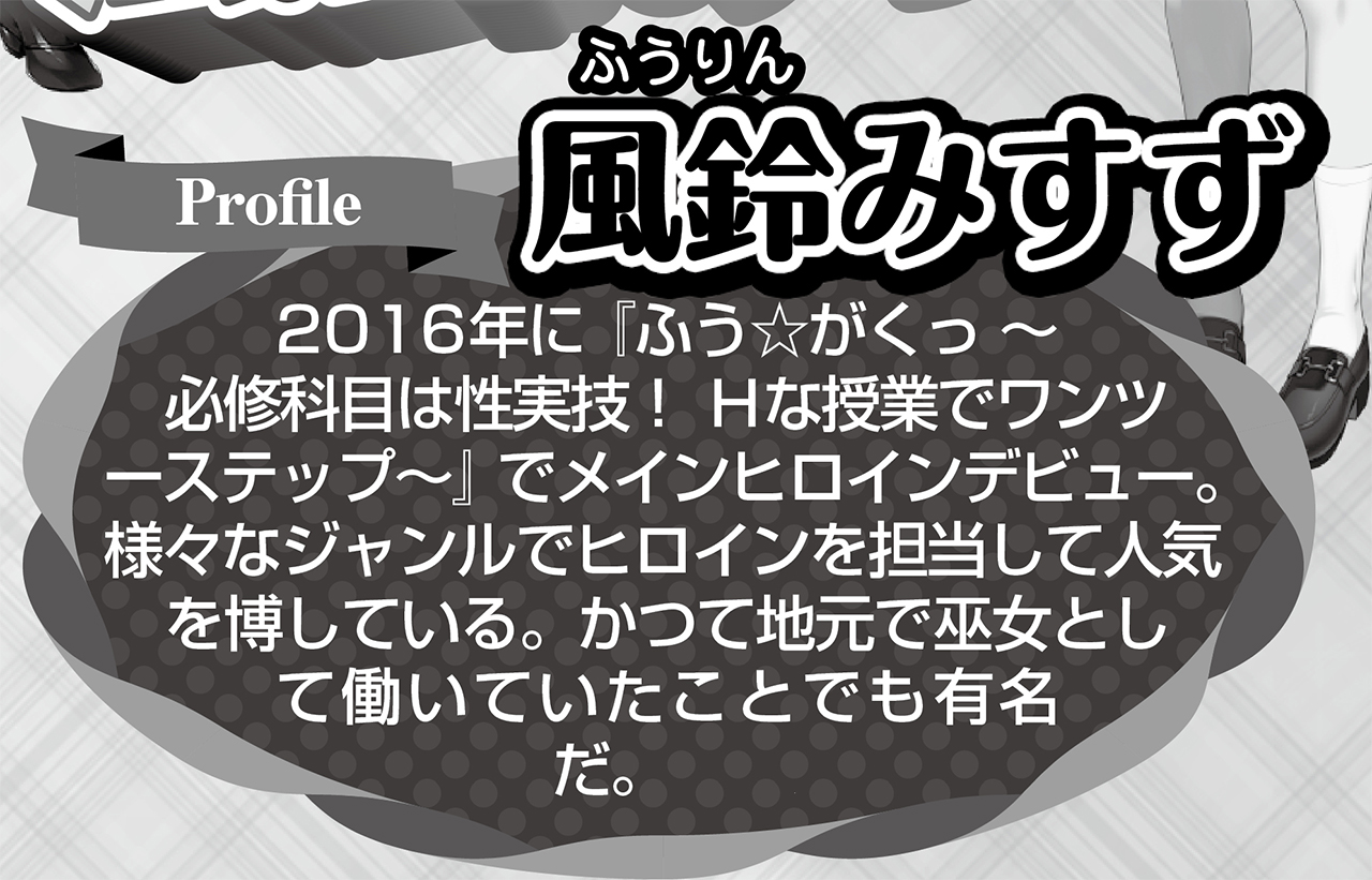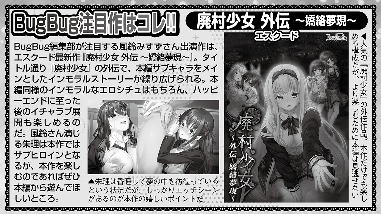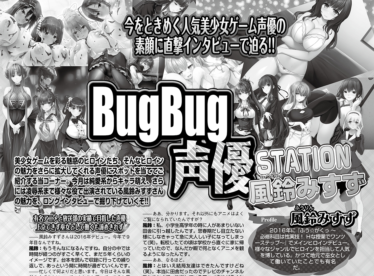 美少女ゲームを彩る魅惑のヒロインたち、その声を演じる声優さんにスポットを当てて紹介するBugBug本誌の人気コーナー「BugBug声優STATION」。BugBug3月号では純愛系からキャラ萌え、さらには凌辱系まで様々な役で出演されている風鈴みすずさんが登場。本誌に掲載された全7ページのロングインタビューの中から抜粋した一部をここで紹介しよう。