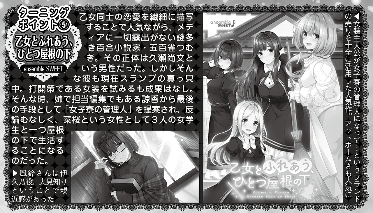 風鈴:近年のゲーム作品ですと、特に印象に残っているのがensemble SWEETさんの『乙女とふれあう、ひとつ屋根の下』です。この作品では口数の少ない人見知りの女の子である文学少女・門倉伊久乃役を演じさせていただきました。内面が普段の自分の考え方と割と近いキャラクタ-だったので、素直な気持ちで等身大の演技で臨んでOKテイクをいただけて、収録も比較的スムーズに進んで、直ぐに終了しました。実は元々『恋する乙女と守護の楯』(AXL)や『オトメ*ドメイン』(ぱれっとクオリア)のような女装主人公作品が大好きで、いつかensembleさんの『乙女』シリーズ作品にも出演することができたらと思っていたんです。その夢が叶って本当に嬉しかったです。水瀬拓未先生のシナリオも甘々で最高にときめきました。