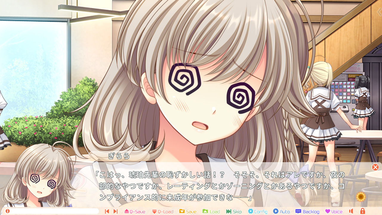 メイン&サブ共に個性ありまくりで面白キャラばかりですが、そんな中で個人的に気に入っているのは、琥珀LOVEな変態…もとい後輩の木下きらら。実は体験版では出番は少なめなんですが、それでもなお強烈に印象に残ります。テンションが高く変な造語を喋って、表情もコロコロと変化し見ていて飽きません。琥珀のことになると妙に早口になるのもキモ…いや微笑ましいですね。