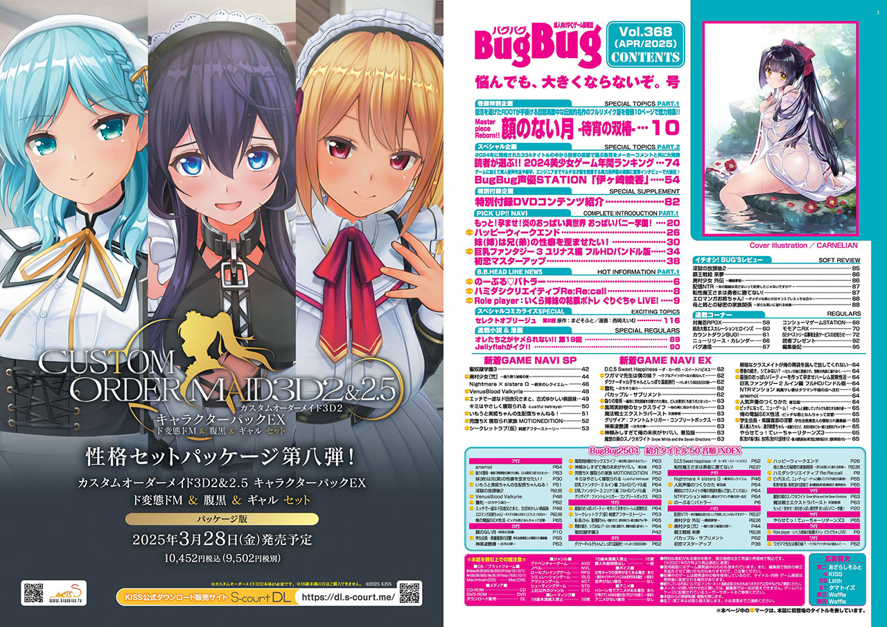関連記事 お値段据え置きでA4サイズに大判化!! 総ページ数は減ったがその分1ページあたりの情報量と迫力も爆上がり 『BugBug』4月号は本日発売!! 何と今月よりA4サイズに大っきくリニューアル!! お値段 ... スマホやタブレットでいつでもどこでもお手軽に最新美少女ゲーム情報をGET!! BugBug3月号の電子書籍版は本日配信!! 電子書籍版には付録のDVDが付いてないけど、かわりに税込1,100円と紙の本 ... 電子書籍版なら紙版より税込で780円も安価にゲットできる!! BugBug2月号の電子書籍版は本日発売!! 今月は新春特大号として、紙版にはいつものDVDに加えてもう一つ「BugBug2025カレンダ ... まずは販売サイトの試し読みサンプルでお宝情報を無料でチェック♪ BugBug1月号の電子書籍版は本日発売!! 電子書籍版には付録のDVDは付いてないけど、税込1,100円と紙の本より安価でお得。デジタ ... 年末年始商戦で注目の美少女ゲーム情報を電子書籍でお得にGET♪ 日曜日だけどBugBug12月号の電子書籍版は毎月10日の本日発売!! 電子書籍なので土日も関係なく販売しているのが嬉しいのだ。 付録D ... 注目の美少女ゲーム情報をスマホやタブレットで手軽にチェック♪ BugBug11月号の電子書籍版は本日発売!! 電子書籍版には付録のDVDは付いてないけど、税込1,100円と紙の本より安価でお得。スマホ ... スマホやタブレットでいつでもどこでもお手軽に美少女ゲーム情報が楽しめちゃう♪ BugBug10月号の電子書籍版は、毎月10日配信なので本日配信!! 電子書籍版には付録のDVDは付いてないけど、税込1, ...